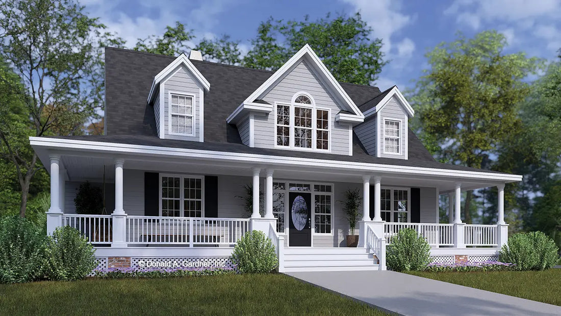 With timeless appeal, this four-bedroom country home features a classic trio of dormers and an inviting wraparound porch that encourages outdoor living. A breezeway connects the main home to a two-car garage with bonus space above—perfect for storage, a home office, or a guest suite.