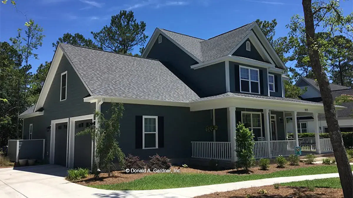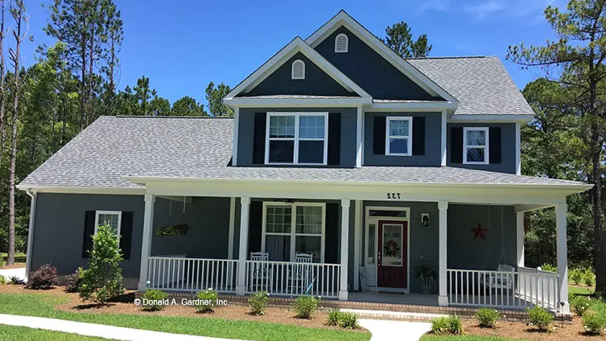 Capturing the Heartland feel, this farmhouse home plan is designed to make an impression. A welcoming front porch guides family and friends inside where they're greeted by a two-story foyer. Columns, French doors, a stunning fireplace and a pass-thru add special touches to this home plan. A bonus room provides space and versatility for changing needs.