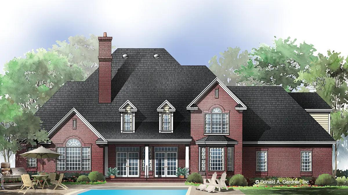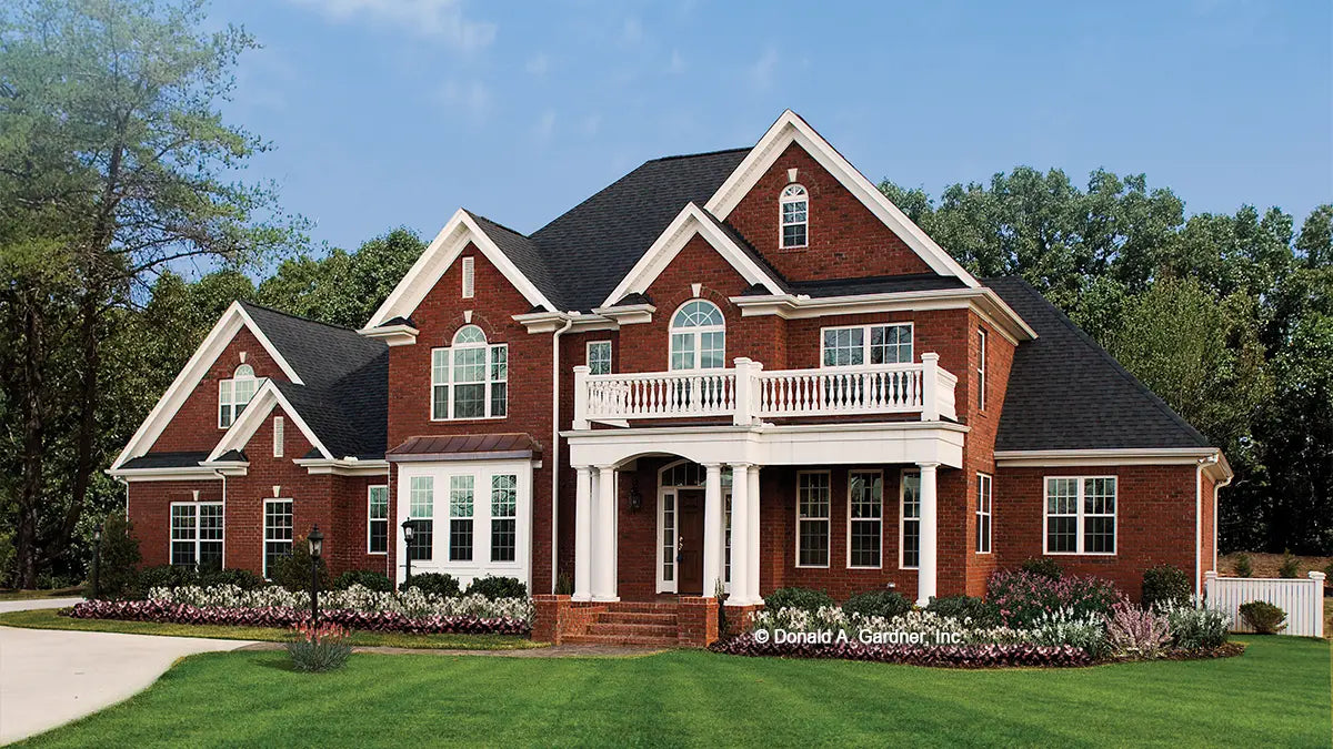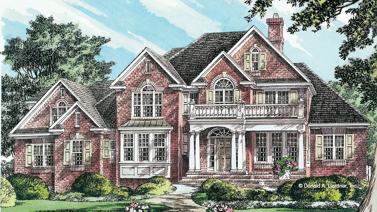 Sophisticated and stately, this two-story Traditional has an abundance of architectural interest and an open, family-efficient floorplan. Columns and an elegant balustrade create a regal entryway, while a box bay window is crowned with a metal roof and accentuated by a Palladian window above it. A hip roof, decorative brickwork and multiple gables add beauty to any streetscape or lot. The foyer features a two-story cathedral ceiling and grand staircase. Interior columns and a balcony separate the great room with its fireplace, French doors and built-in cabinetry. The kitchen is complete with a convenient central island and is open to the breakfast bay. The master bedroom includes a tray ceiling, and two secondary bedrooms showcase vaulted ceilings. Note the bonus room and the large utility area.