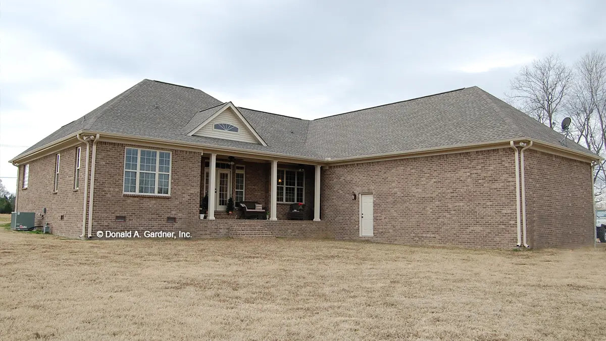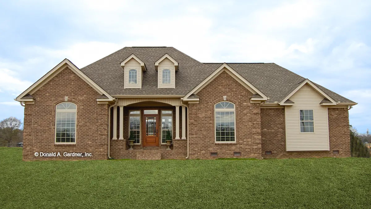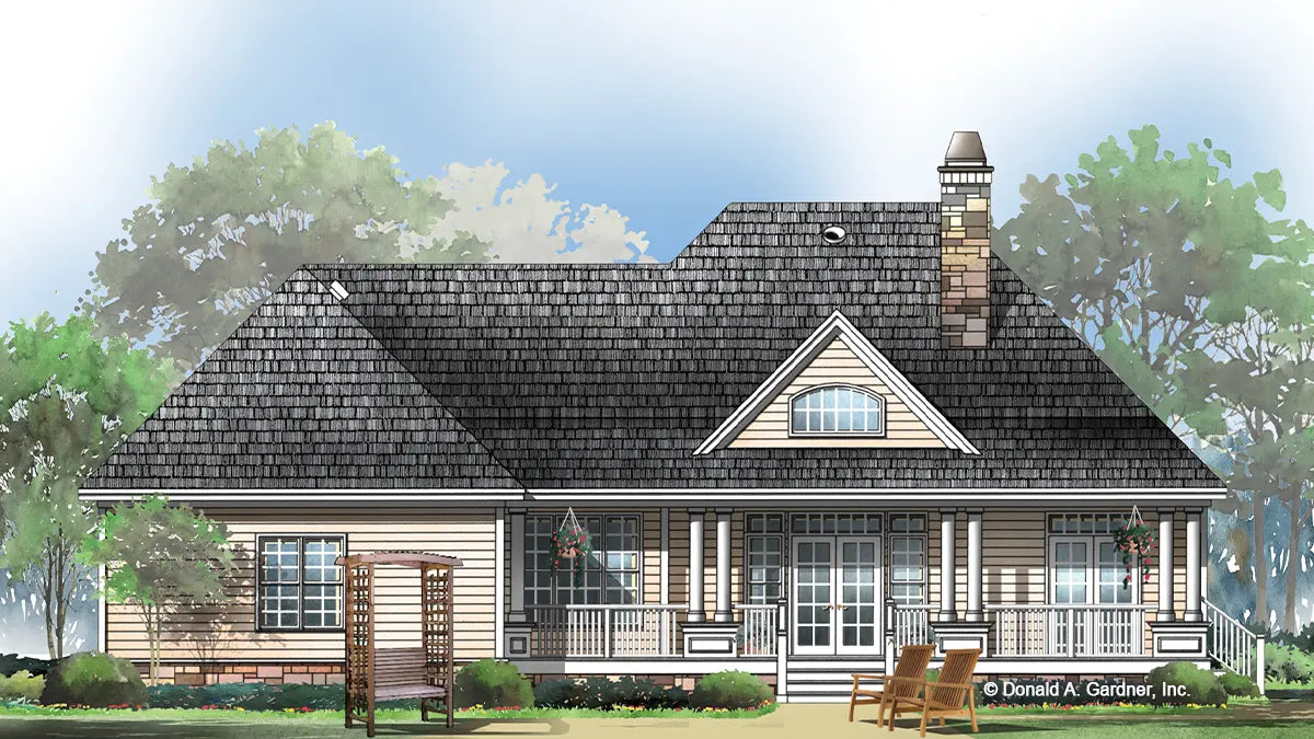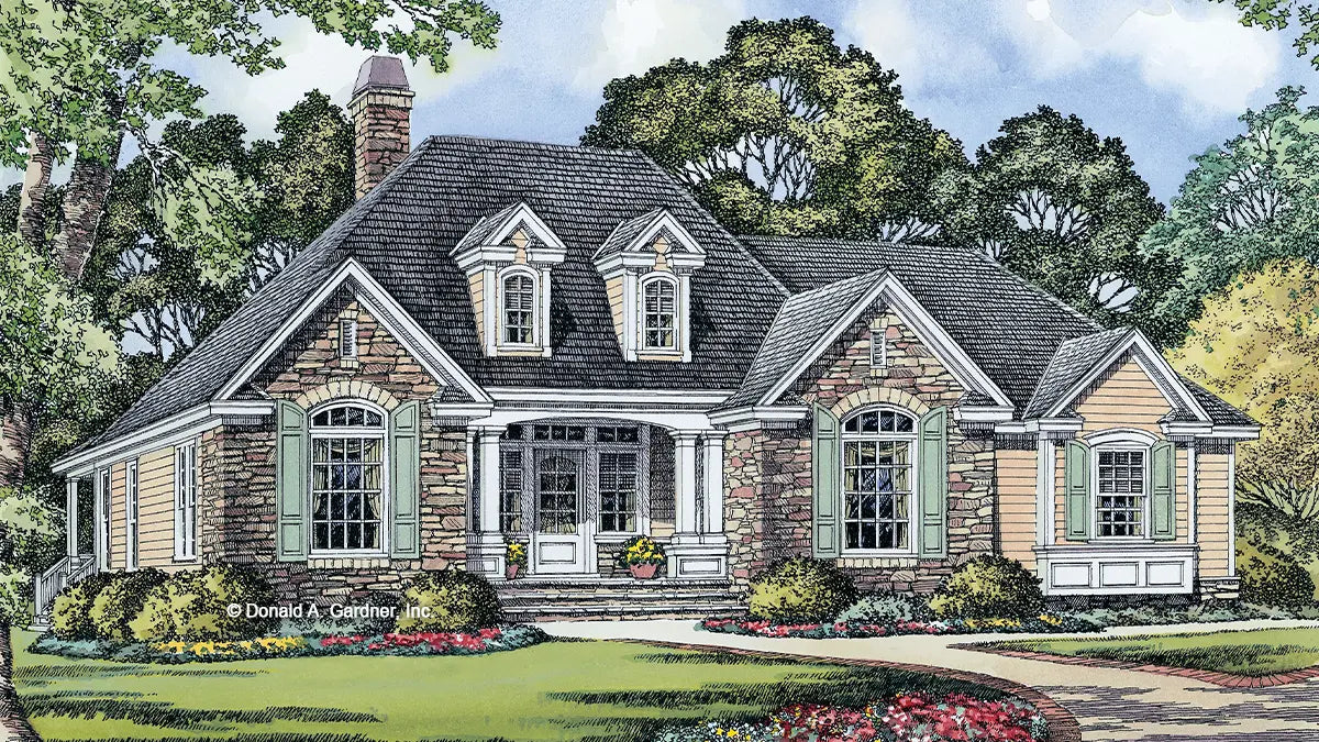 This charming cottage house plan showcases stone and siding while arched and shutters frame the windows. Porches expand living, and a side porch creates a service entry into the utility/mudroom. While closets and columns flank the entrance to the great room with its cathedral ceiling and French doors, a counter separates the kitchen from the great room and breakfast nook.