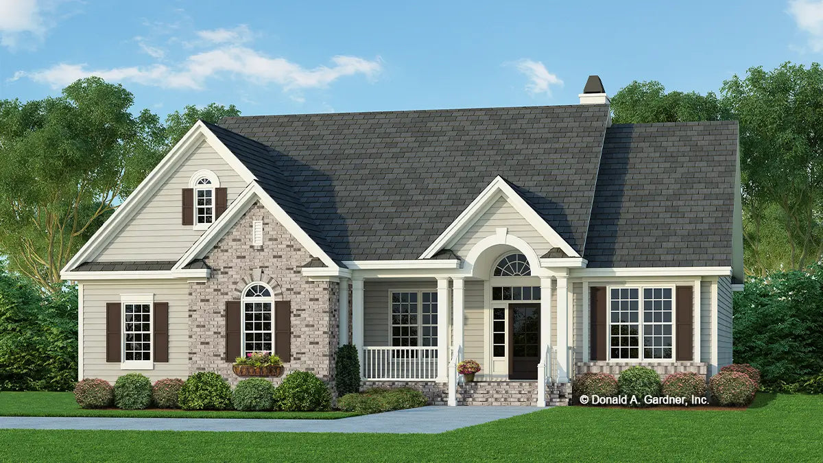 Arched transoms soften gables, adding curb appeal to this Traditional house plan. Three sets of columns create a dramatic front entry, while French doors accent the rear porch. The interior is family-efficient. Double doors lead to the versatile study/bedroom, while decorative ceiling treatments and a breakfast bar keep the common rooms open.