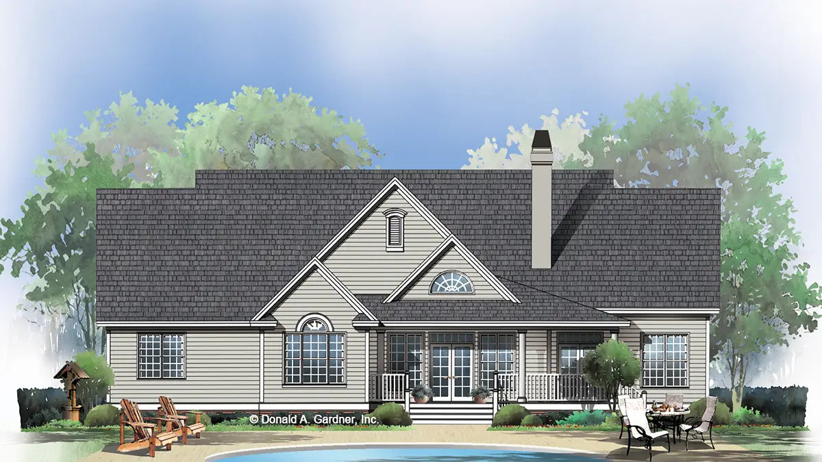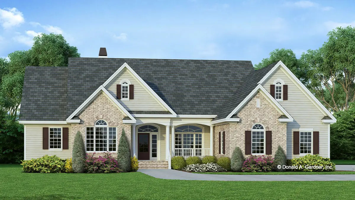 Arches and transoms contrast with gables and columns for a striking exterior on this Traditional ranch plan. The foyer leads eyes to the open great room and dining room with its columns. French doors access the rear porch from the master suite, great room and breakfast nook. Note the pantry, bonus room and built-in cabinetry.