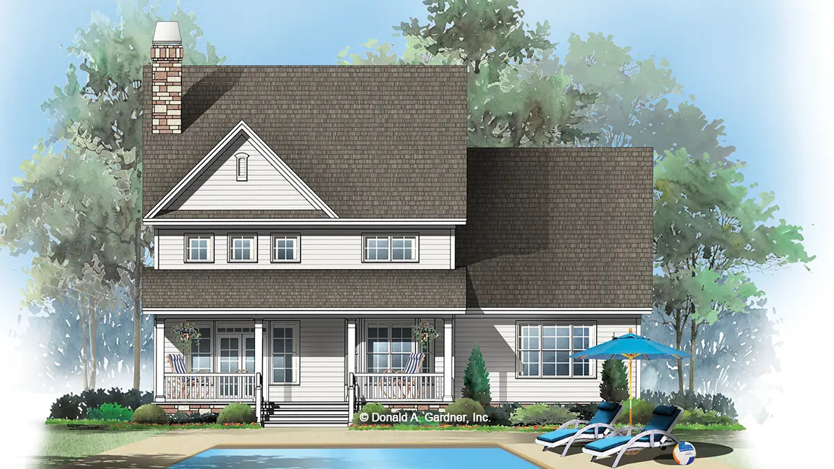 Stone, siding and metal roofing over the front porch and garage dormer add a touch of the arts-n-crafts to a farmhouse style. Three columns create an inviting entrance, while a sidelight and transom enhance the front door and usher in natural light. Inside, a natural traffic flow follows a circular pattern. A bay window expands the breakfast nook, and a serving counter separates the kitchen from the great room. Built-in cabinetry lies on both sides of the fireplace, and French doors lead to the rear porch. Dividing the open, two-story foyer from the great room, a balcony leads to two secondary bedrooms and a large bonus room. The bonus room could even be transformed into a guest suite, or it could be divided to form two areas.