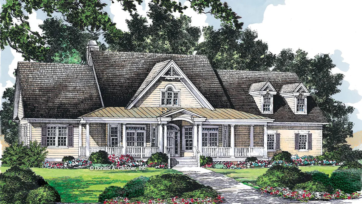 Starting with a massive front porch covered with a metal roof, a prominent gable with a Palladian window and decorative bracket, and two bay windows with French doors, this farmhouse plan evokes a rugged sophistication. Inside, positioning and architectural features give room definition, while keeping an open floorplan. Tray ceilings top the versatile study/bedroom, master bedroom, dining room and breakfast nook, while an angled counter separates the kitchen from the great room and breakfast nook. A vaulted ceiling caps the great room, expanding visual space. The common rooms divide the master suite from the secondary bedrooms, promoting peace and quiet. Two large walk-in closets provide plenty of storage space, while the well-equipped master bath includes twin vanities, a private privy, garden tub and spacious shower.