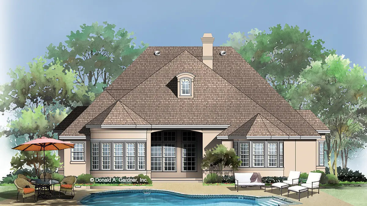 A stucco exterior, high-pitched roof with hipped gables and towering entryway give this home a distinct European appearance. Two art niches highlight the master suite's entry hall. Elegant columns, twin vanities, a garden tub and private privy complete the master bath. Multiple ceiling treatments exhibit an abundance of architectural interest inside the home.