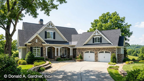 This traditional house plan has a classic facade with multiple gable pitches and twin dormers radiate curb appeal. The interior is equally as stunning. From tray ceilings, to large bedrooms this house plan's interior layout is modern and overflowing with architectural details. The secondary bedrooms each have a walk-in closet and are quite spacious. The master bedroom in this house plan includes a vaulted ceiling and rear porch access, while two walk-in closets and a pampering master bath complete the suite. A study and elegant dining room are just off the foyer. Defined by columns, the dining room also features a tray ceiling for added interest. The house plan's great room accesses a rear porch and custom features include built-in shelves, a fireplace and a cathedral ceiling.