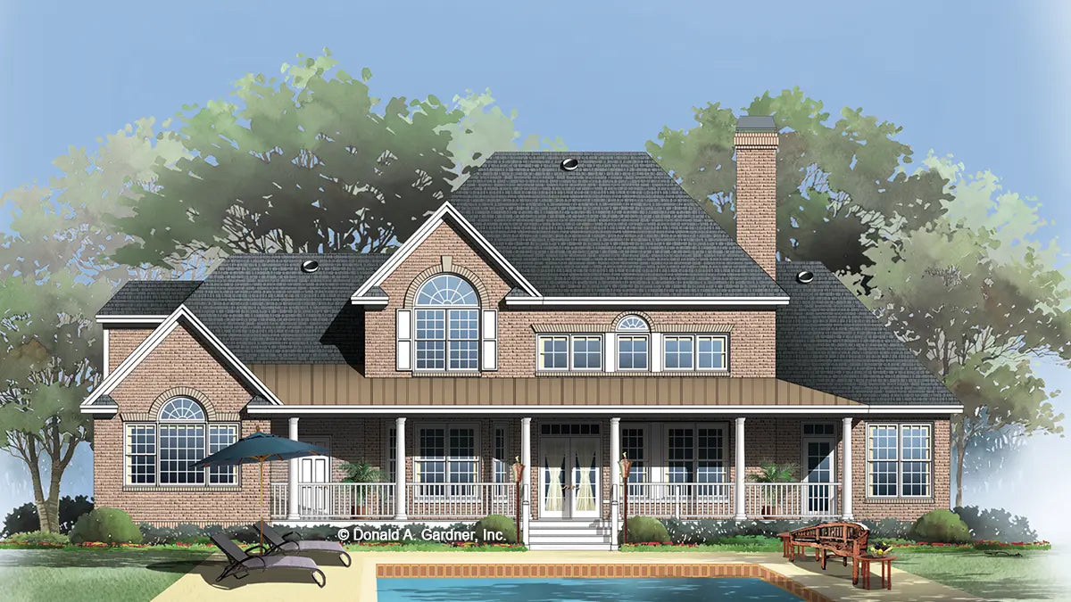 Wrapping a traditional brick exterior with two country porches creates a modern exterior that's big on Southern charm. Bold columns and a metal roof welcome guests inside this house plan's equally impressive interior. Both the foyer and great room have two-story ceilings, and a tray ceiling tops the master bedroom. A bay window expands this house plan's breakfast nook, while French doors lead to the rear porch. The generous laundry room provides space for more than just washing clothes. The first-floor master suite in this house plan is complete with linen shelves, two walk-in closets and master bath that features a double vanity, garden tub, separate shower and private privy. An additional bedroom on the first level becomes the perfect space for guests. With porch access and an adjacent bath with porch access, this room is ideal for overnight friends and family. The second level boasts three additional bedrooms and a large bonus room.