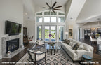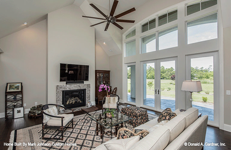 Stone and shakes create a striking facade, and an arched portico mirrors the graceful curves of exterior windows. French doors and windows usher in light and views, while columns and a fireplace complement the cathedral great room. The spacious gourmet kitchen features an angled island and is open to the great room and vaulted dining room. A generous walk-in pantry is located nearby.