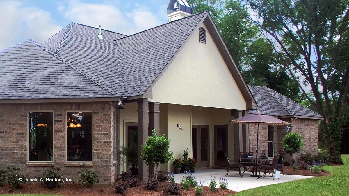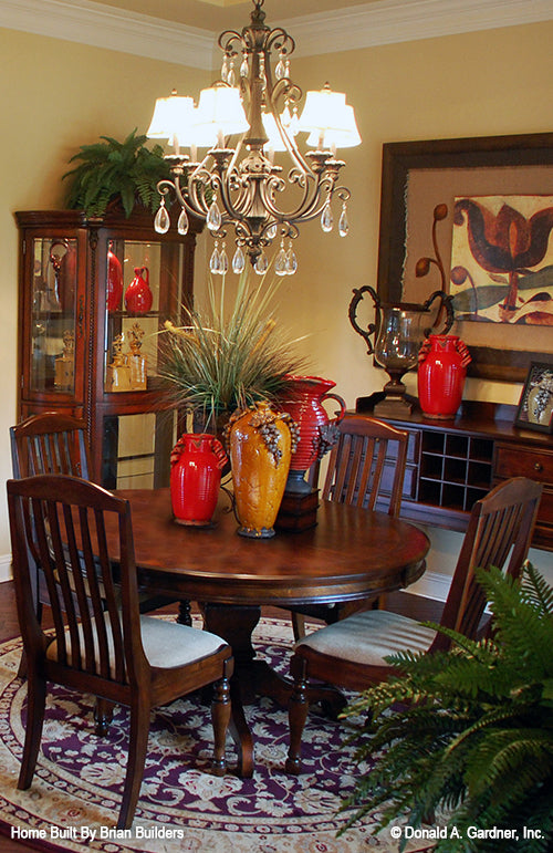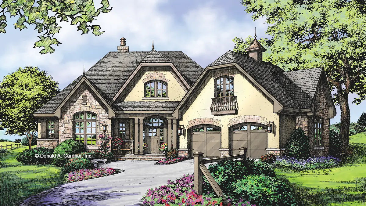 European styling and thoughtful details create The Sorvino's stunning exterior. Combining mixed materials, clipped gables and arched windows, this home plan enjoys immense curb appeal. Inside, thoughtful details continue. A gallery style foyer opens to the cathedral great room and unique angled dining room. Decorative columns, French doors and a fireplace add drama and luxury to the open living space. The well-planned angled kitchen is a cook's dream, and is open to the great room, curved breakfast nook and dining area. In the master suite, elegant touches include double-door entry, tray ceiling, porch access and a bowed window to capture rear views. Dual walk-in closets and an ensuite bath complete the package. Two additional bedrooms enjoy walk-in closets as well, and share a dual-vanity hall bath. The Sorvino offers convenience as well as style, including a reach-in pantry, spacious utility with sink, and bonus space perfect for media room, hobby room or future expansion.
