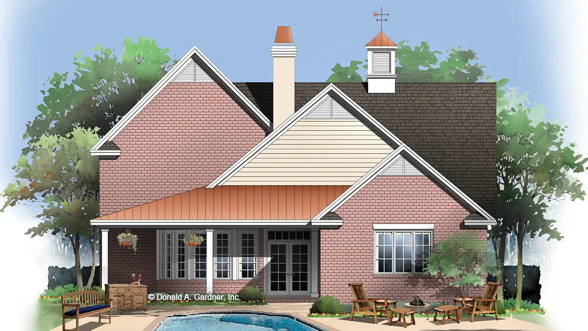 This dramatic narrow home features many extras that homeowners frequently request. Metal roofing tops a bay window and front porch, while gable peaks crown the front-entry garage. Inside, the stunning staircase flows through the entry hall, greeting visitors in grand fashion. An open dining room is defined only by columns, yet also includes a tray ceiling and art niche to showcase custom details. The curved great room overlooks a large porch through several windows that usher light into the whole home. Completely open to one another, the kitchen and great room are spacious and modern, with built-in shelves and an E-space. Tucked away in the rear of the home, the master suite also includes porch access, in addition to a tray ceiling, luxurious master bath and his-and-her walk-in closets. Upstairs, a large bonus room could be a wonderful home theater, while two secondary bedrooms share a Jack-and-Jill bath.