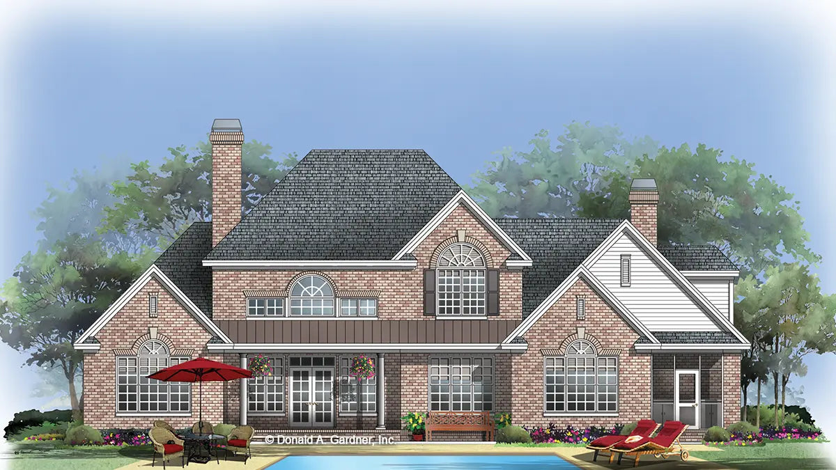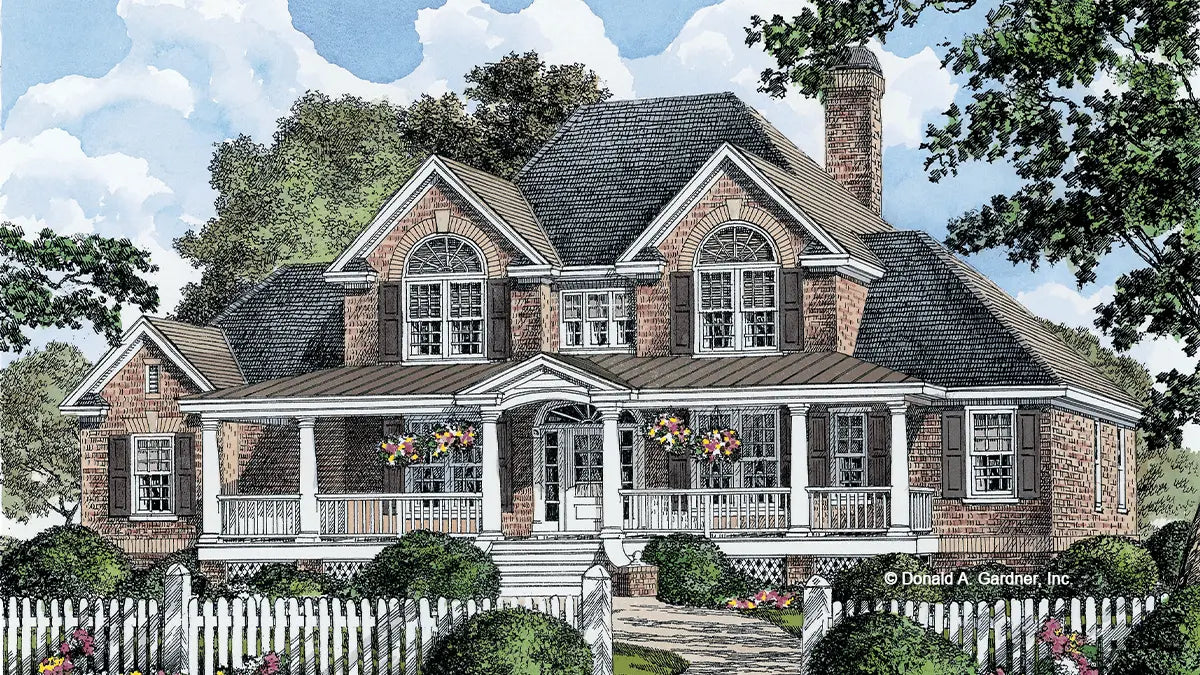 A brick exterior, twin dormers, and an expansive, columned front porch combine to give this home plan a stately facade. Inside, a private master bedroom wing, soaring two-story great room open to the kitchen, three upstairs bedrooms, and a secluded rear family room with adjoining screen porch make this an ideal family home plan.