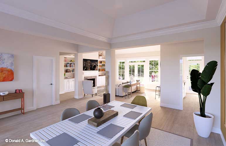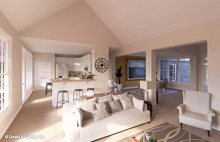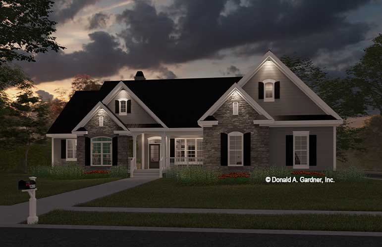 With its range of expansion possibilities and adaptable floor plan, The Astaire delivers luxury that works for everyone. Stone accents provide a textural contrast to this classic one-story luxury home, while a front porch with columns brings a bit of southern charm. Home plans that offer flexibility, like this one, allow its owners to adapt it to their needs. For example, the fourth bedroom would also make an excellent space for a study. The great room works well for entertaining, as it offers rear porch access, to take the party outside. The utility room's proximity to the pocket office makes it easy for parents to tackle laundry and be nearby when kids are doing their homework. Another option that adds to this luxury home's convenience and adaptability is its optional 421 sq. ft. bonus room. It can function as a guest suite, hobby room, or children's playroom.