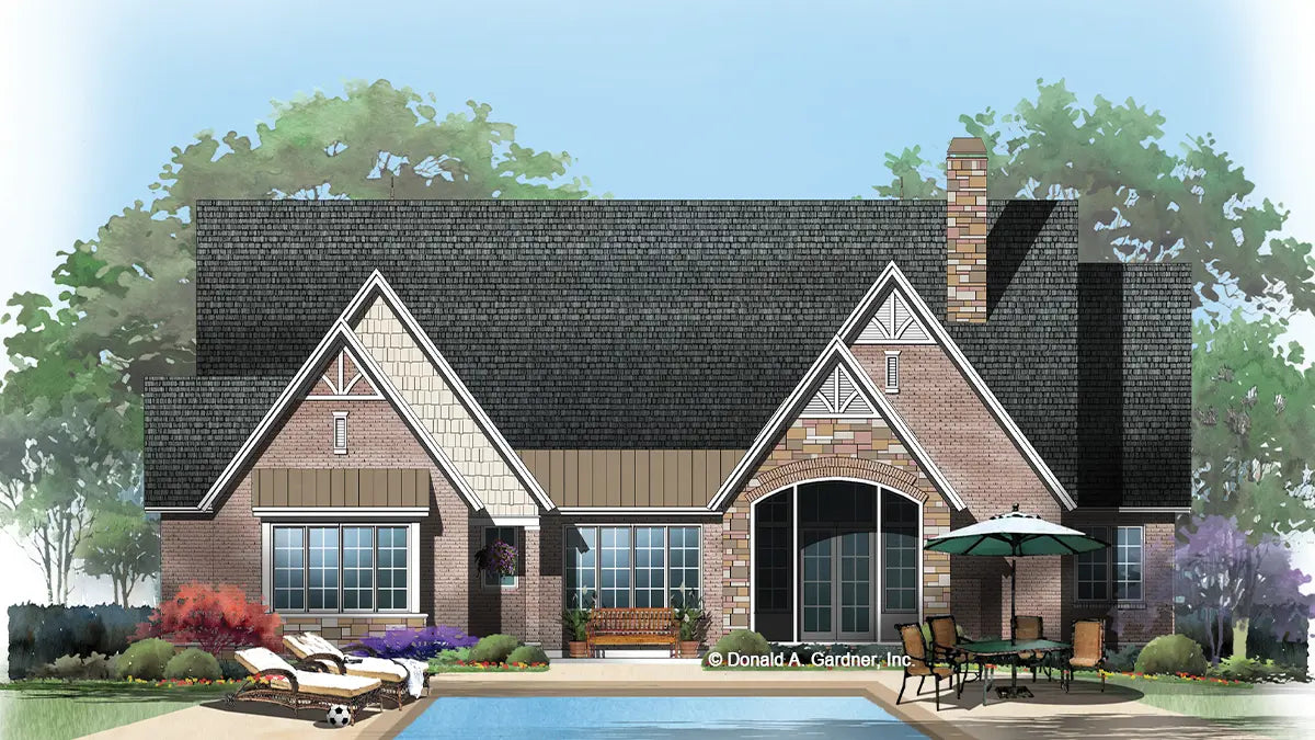 Stonework and shed dormers give an Old-World feel to this open floor plan home. This plan is packed full of attractive details, like a coffered ceiling over the dining room, window seats in each bedroom, and sky lights above the screen porch. With abundant garage storage, a spacious utility room, and an angled kitchen bar this home that is as practical as it is eye-catching.