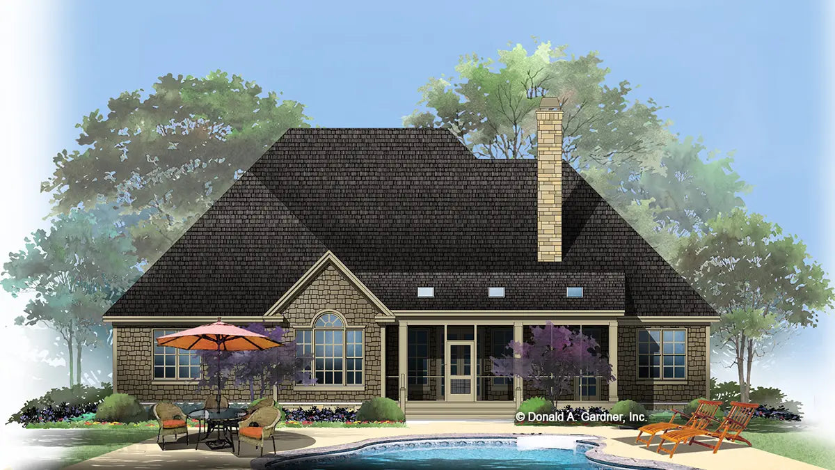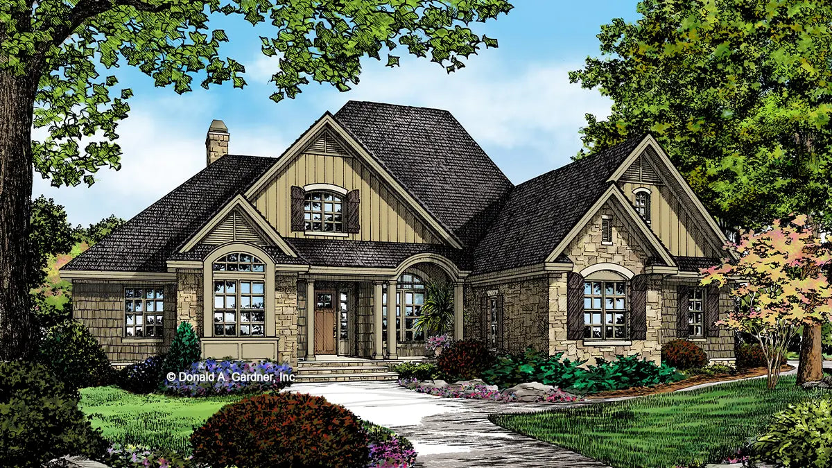 Arch-topped windows and striking gables give character to this graceful ranch home plan. Inside, cathedral and tray ceilings in the living spaces give this home plan a spacious feel, with French doors and large windows facing the rear of the home. A coat closet and mud room off the garage help keep messes hidden, and the laundry room includes counters for extra workspace. The master suite features a tray ceiling, screen porch access, and two walk-in closets in this home plan.
