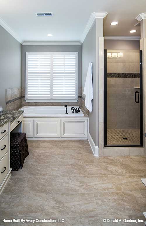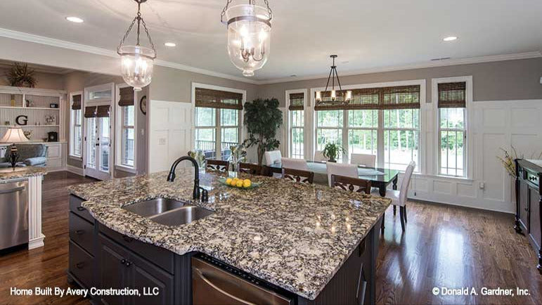 This design is centered around open living space, with a cathedral great room and dining room meeting at the expansive kitchen. A walk-in pantry, coat closet, and utility room sit between the garage and the kitchen, convenient yet out of the way. Two bedrooms share a Jack-and-Jill bathroom at the rear of the plan, while the study and master suite are positioned across the plan for privacy.