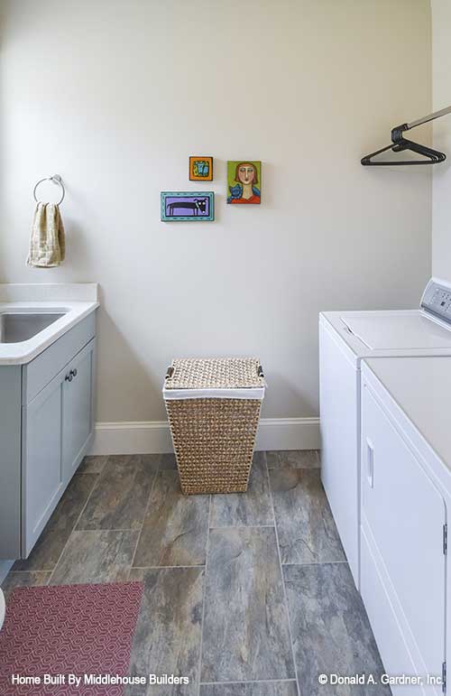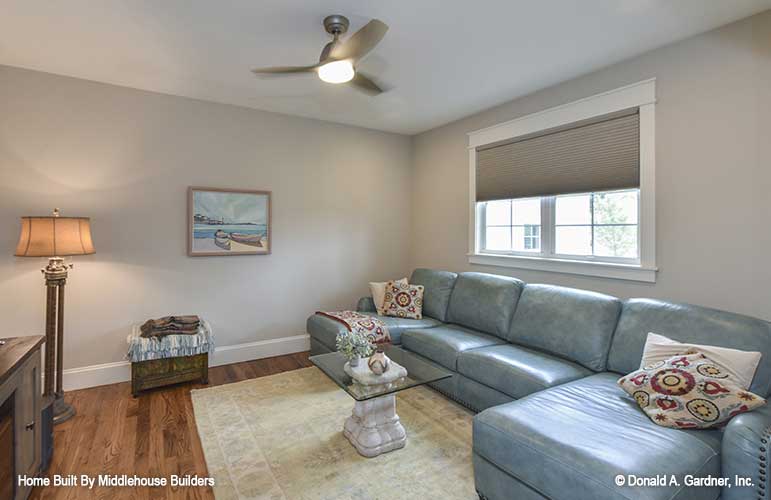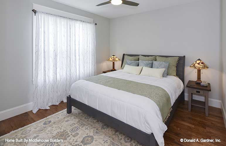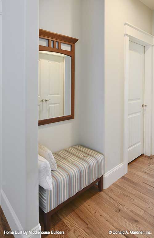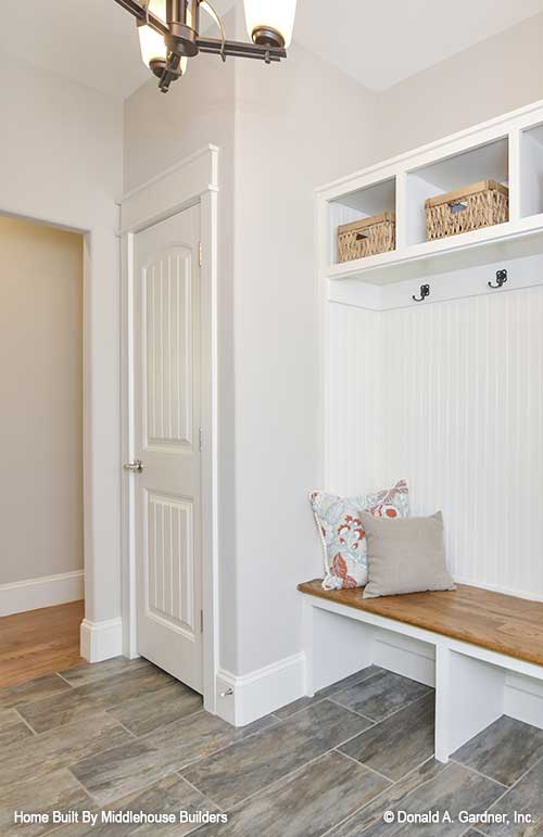 Gables and mixed materials give Craftsman character to this traditional home plan with an efficient, open layout. A U-shaped kitchen keeps appliances close at hand, while providing plenty of work space with a view to the rear. The bedroom/study provides flexible space with a charming window seat and coffered ceiling, and each additional bedroom has its own walk-in closet. Functional space includes a pantry, utility room with laundry sink, and mud room with coat closet and built-in shelves.