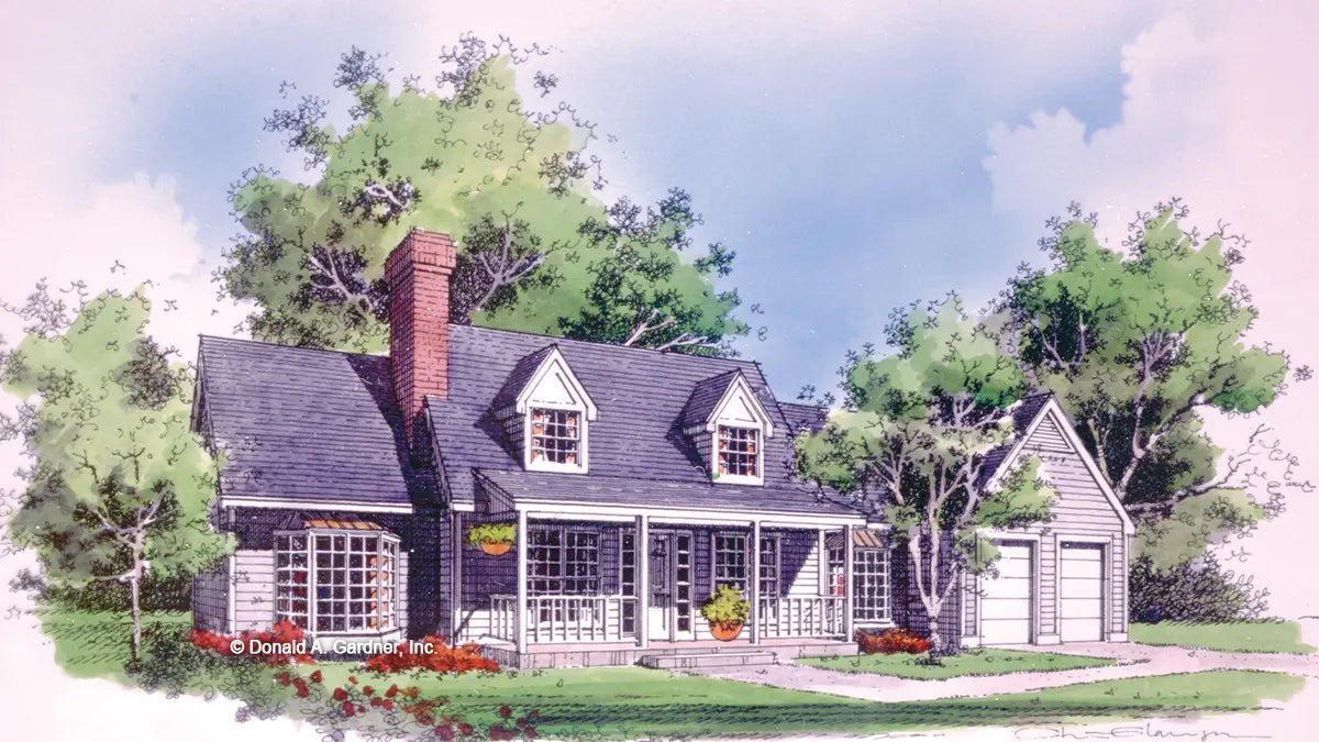 Bay windows & dormers give this country cottage floor plan a romantic air, while a greenhouse adds an element of surprise. The bayed family room is open to a well-planned kitchen, which services both the breakfast area and dining room. The great room and breakfast area access the large deck, which flanks the greenhouse on three sides. A fireplace in the master bedroom of this house plan adds to the romantic appeal, while upstairs, two dormered bedrooms share a bath.