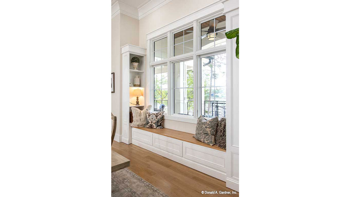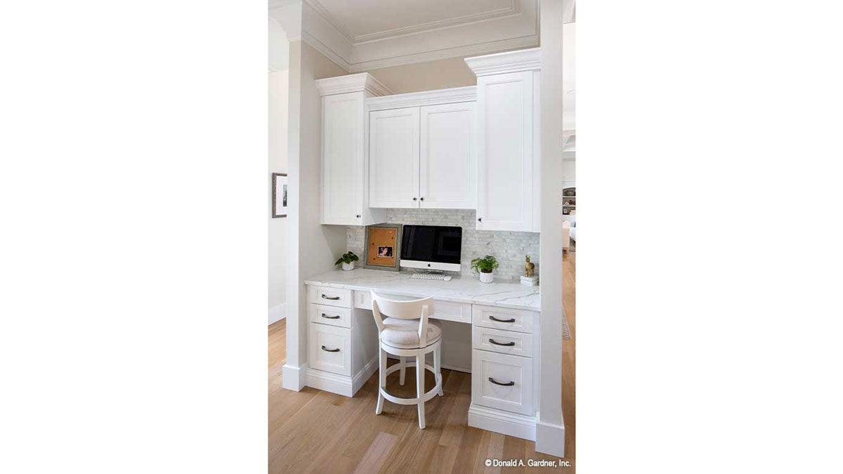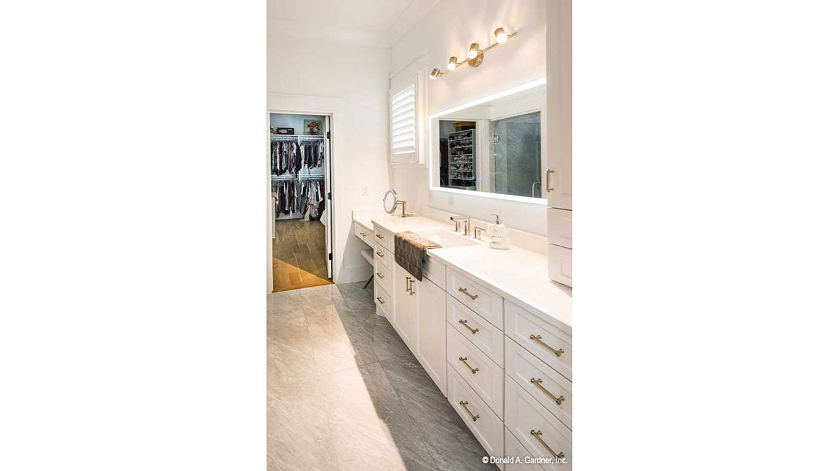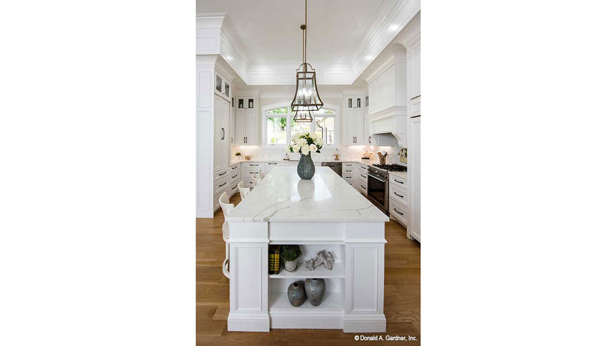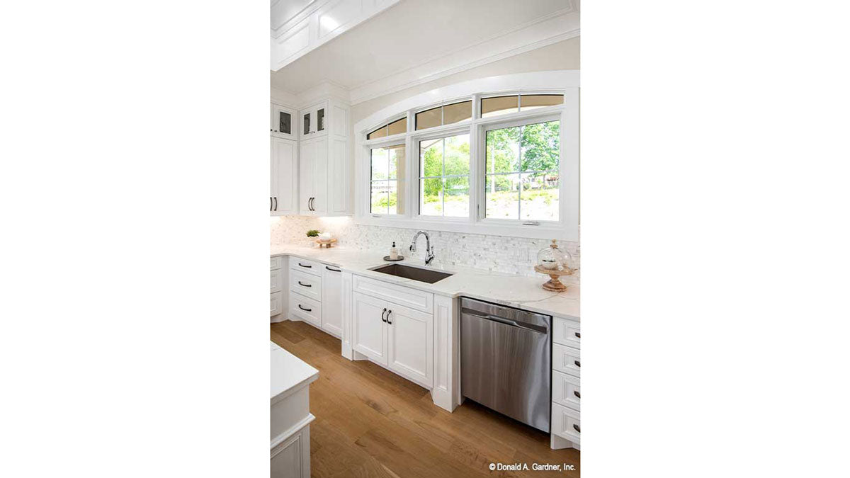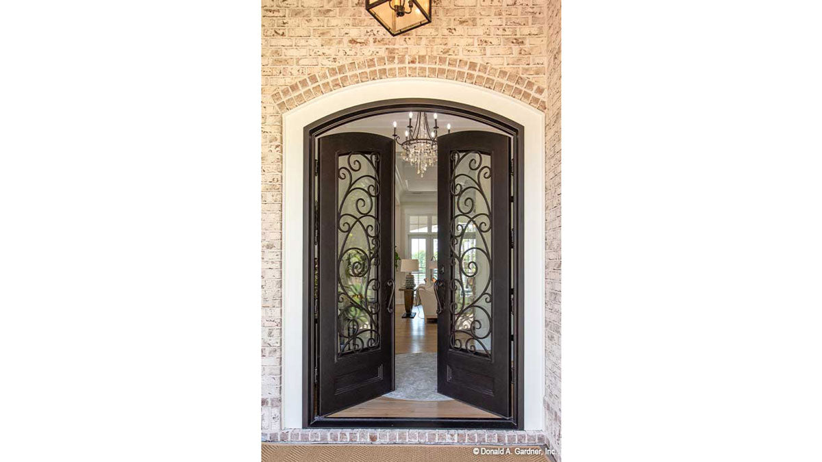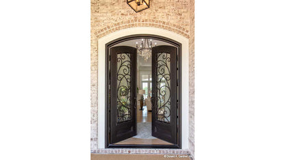 The Sarafine is a luxury home design on a hillside walkout foundation. Arches and a cupola highlight the exterior, along with a metal accent roof. The kitchen island, with cooktop, faces the great room and the dining room offers a serving bar and a nearby walk-in pantry. A sitting room accompanies the elegant master suite. The oversized utility room enjoys a laundry sink, built-in cabinetry and access to the side porch. Downstairs, find two bedrooms, a media/game room, and a workshop.