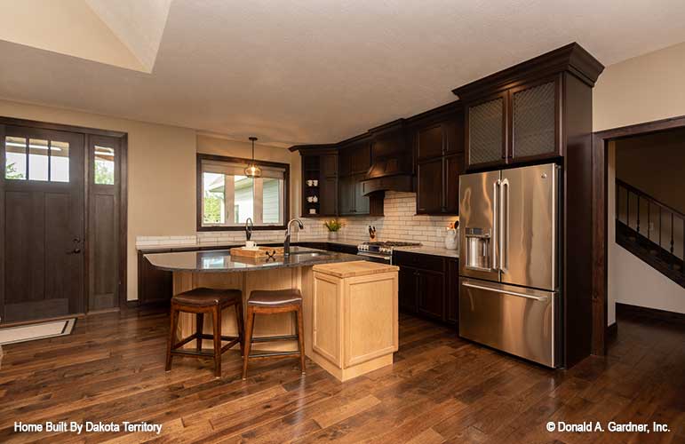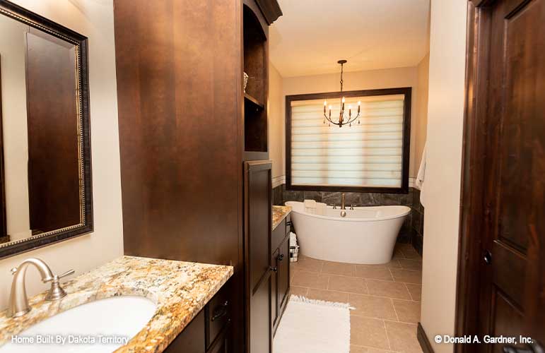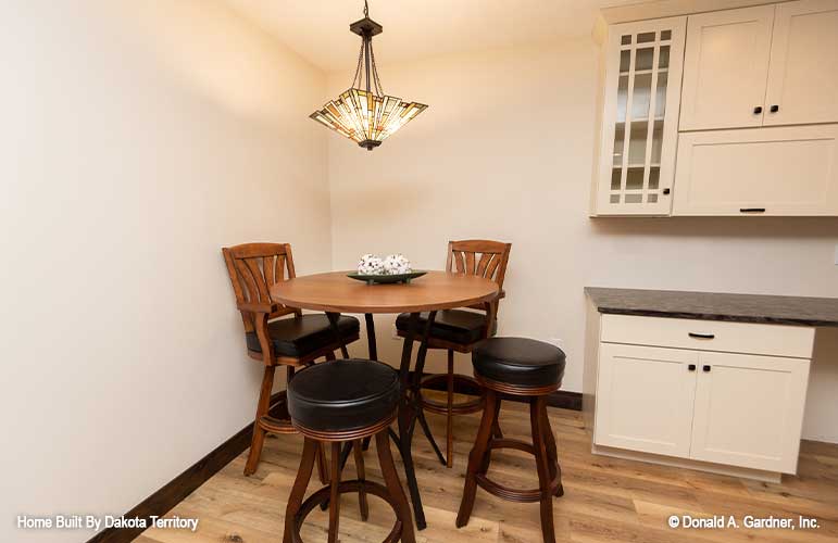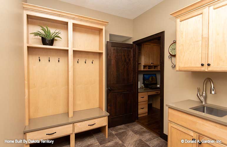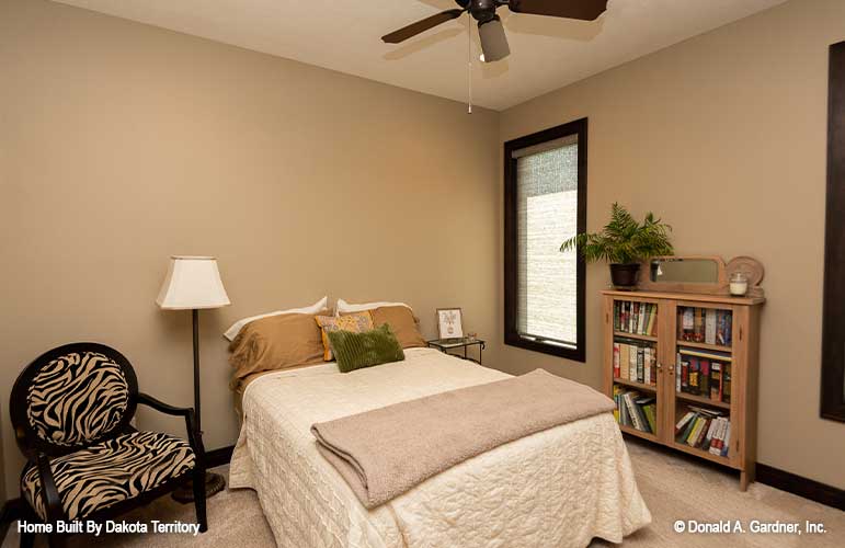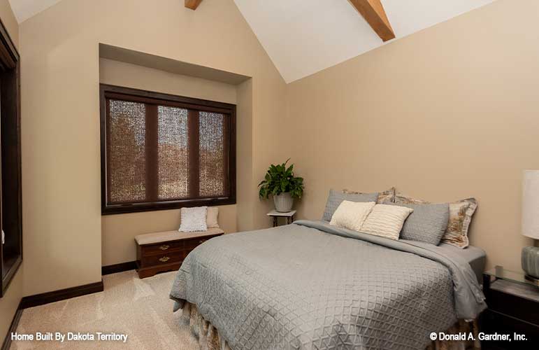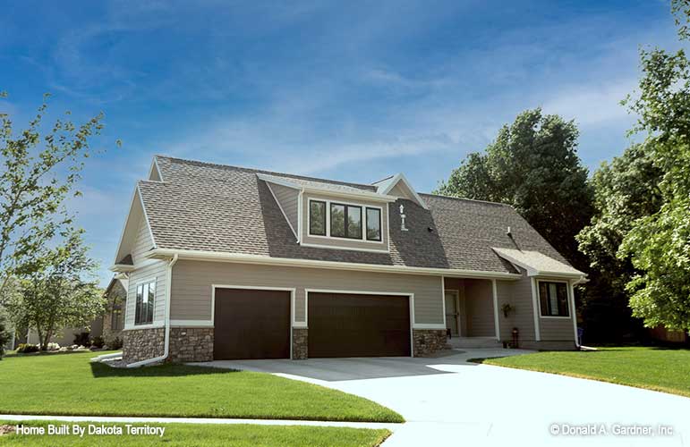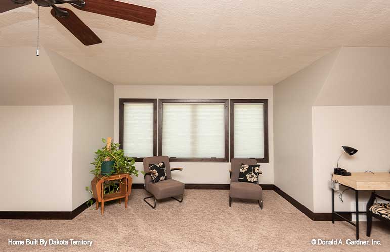 This small cottage house plan enjoys open living spaces and a split bedroom layout. The great room and dining room flow into one another, while the efficient kitchen is open to both with its angled seating bar. A walk-in pantry, coat closet, and e-space are located near the garage for convenient unpacking, and a large utility room provides storage and workspace. The garage includes storage and shelving space, its own covered entry, and a bonus room above awaiting expansion. The cozy master suite is situated for privacy, with access to relaxing covered porches with skylights.