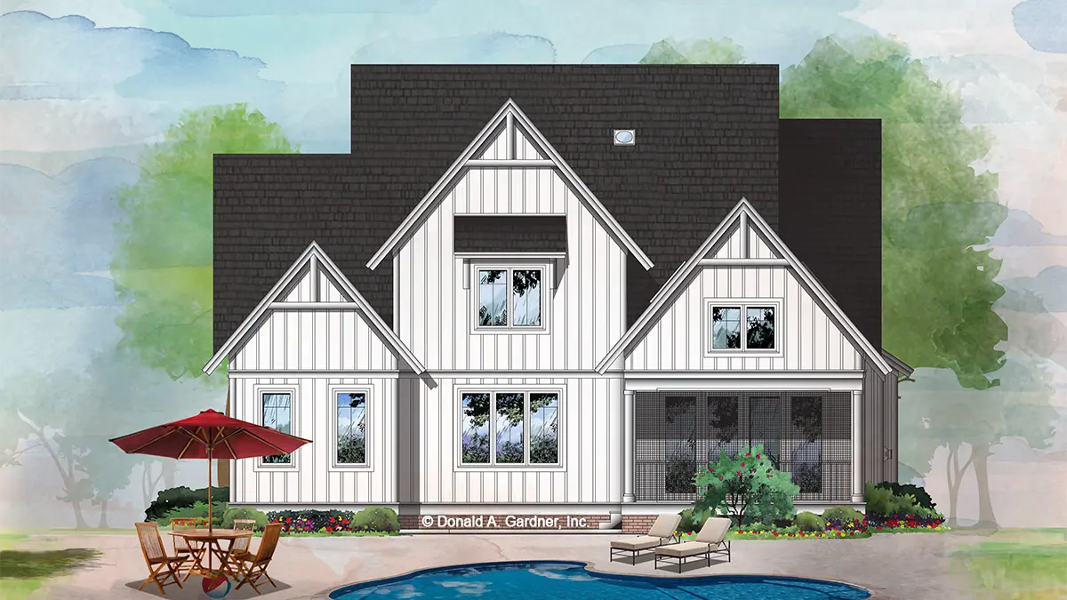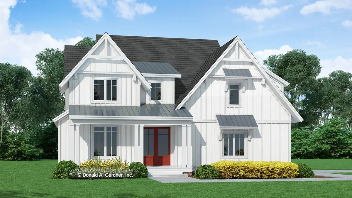 his modern cottage exudes charm and conceals spacious living behind a narrow facade. The simple exterior is adorned with board-and-batten, metal roof accents, and decorative gable brackets. Inside, an impressive five-bedroom layout is ideal for a large family with the master suite conveniently on the first floor. A thoughtful utility room with laundry sink, an island kitchen, and a screened porch with skylights enhances everyday living while a single dining room and cozy great room encourage family togetherness.