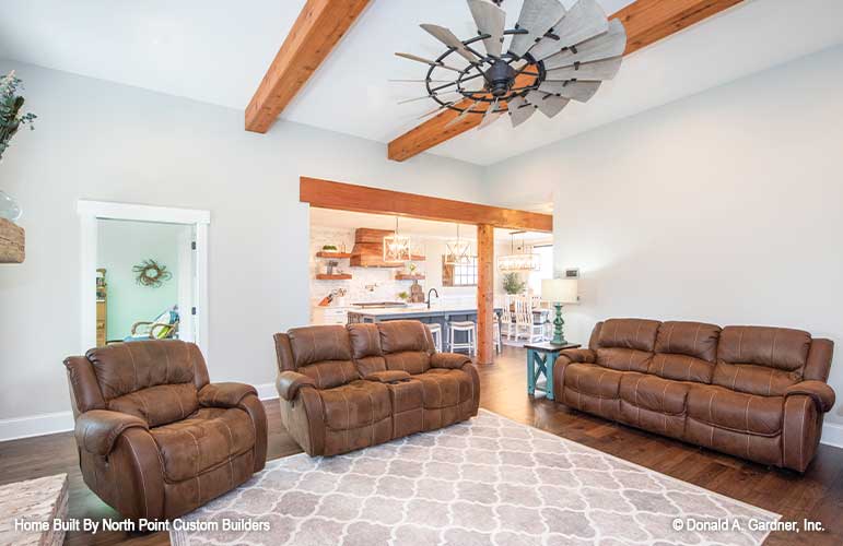This is the first floor plan image for four bedroom house plan 1478 The Zander if the home is built over a basement
