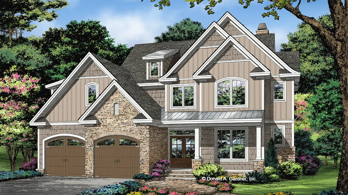 Stone and cedar shakes meet board-and-batten in this narrow two-story design. Multiple gables draw the eye upward and metal accents adorn the roof. Arched garage bays are mirrored by arched windows for a unified facade. A spacious kitchen island is completely open to the great room and a sitting room and dining room adjoin. Skylights top the master bedroom and the master closet has direct access to the utility room. The pantry is accessible from the garage, no more carting dry-good groceries through the house. A flexible bedroom/study is downstairs and two additional bedrooms are upstairs with a rec room and bonus room.