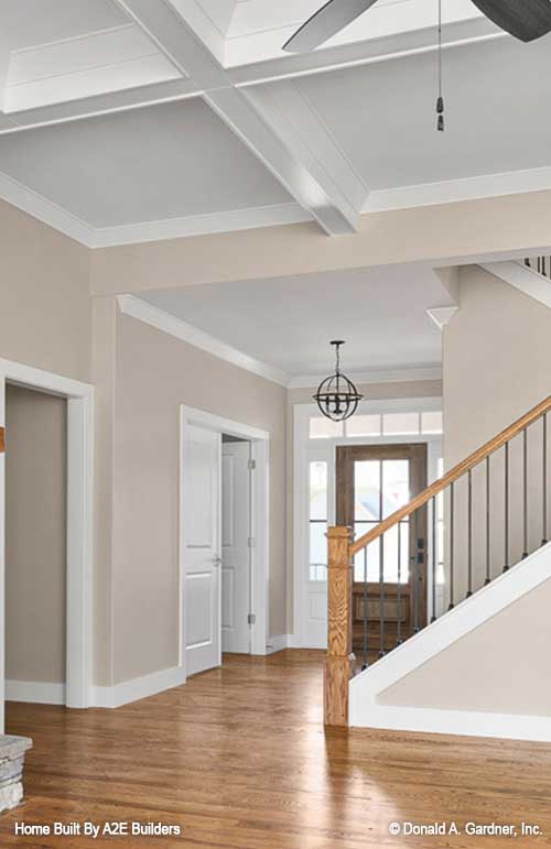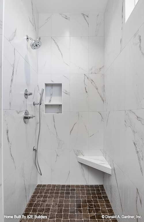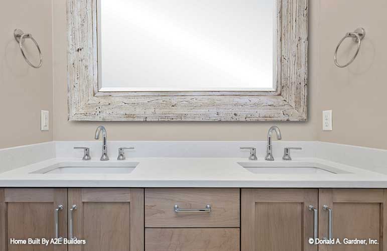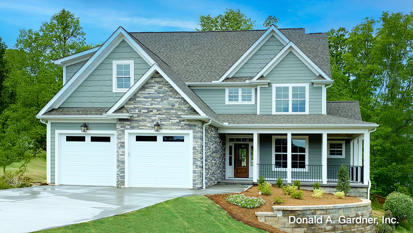 With a front-entry garage and a slim width, this two-story design is ideal for a narrow lot. Arched garage doors add character while a mix of stone, shakes and siding bring dimension to the exterior. Inside, luxury features abound with a drop zone, butler's pantry and a large storage pantry. Skylights top the rear porch and the master bedroom and bathroom to flood these spaces with natural light. The first floor creates an easy flow between the island kitchen, dining room and great room. The master suite and a bedroom/study are downstairs while two bedrooms and a bonus room complete the second floor.
