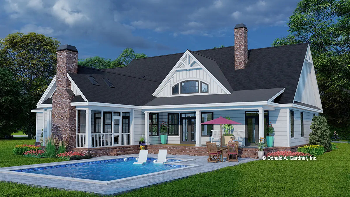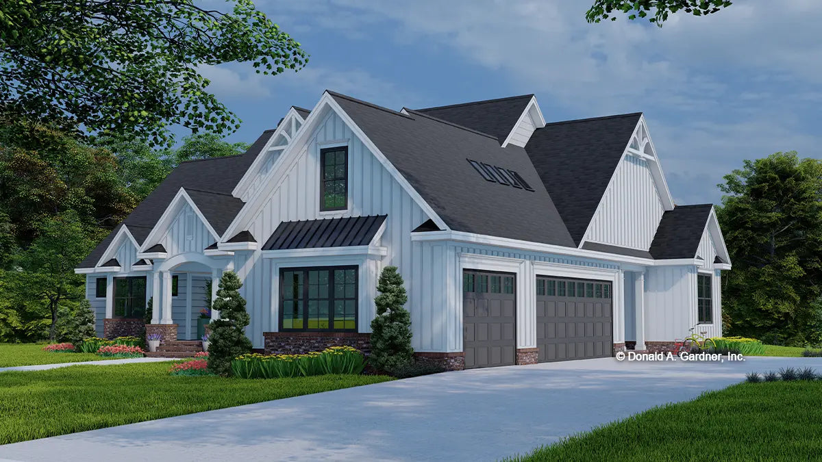 Modern farmhouse style graces the facade, from the board-and-batten siding to the black frame windows, while an arched portico presents a grand entry with an eye-catching red front door. The great room, kitchen, and dining rooms create an easy flow and a rear screened porch with skylights takes living outdoors. The master suite is a private wing with a tray ceiling, outdoor access, dual walk-in closets and a spacious bathroom. A bedroom/study provides versatility and two additional bedrooms are available. The mud room entry offers convenient storage, along with a pantry, and the utility room is adjoining with a laundry sink and built-in cabinets. A bonus room above the garage meets the homeowners needs for storage or additional square footage.