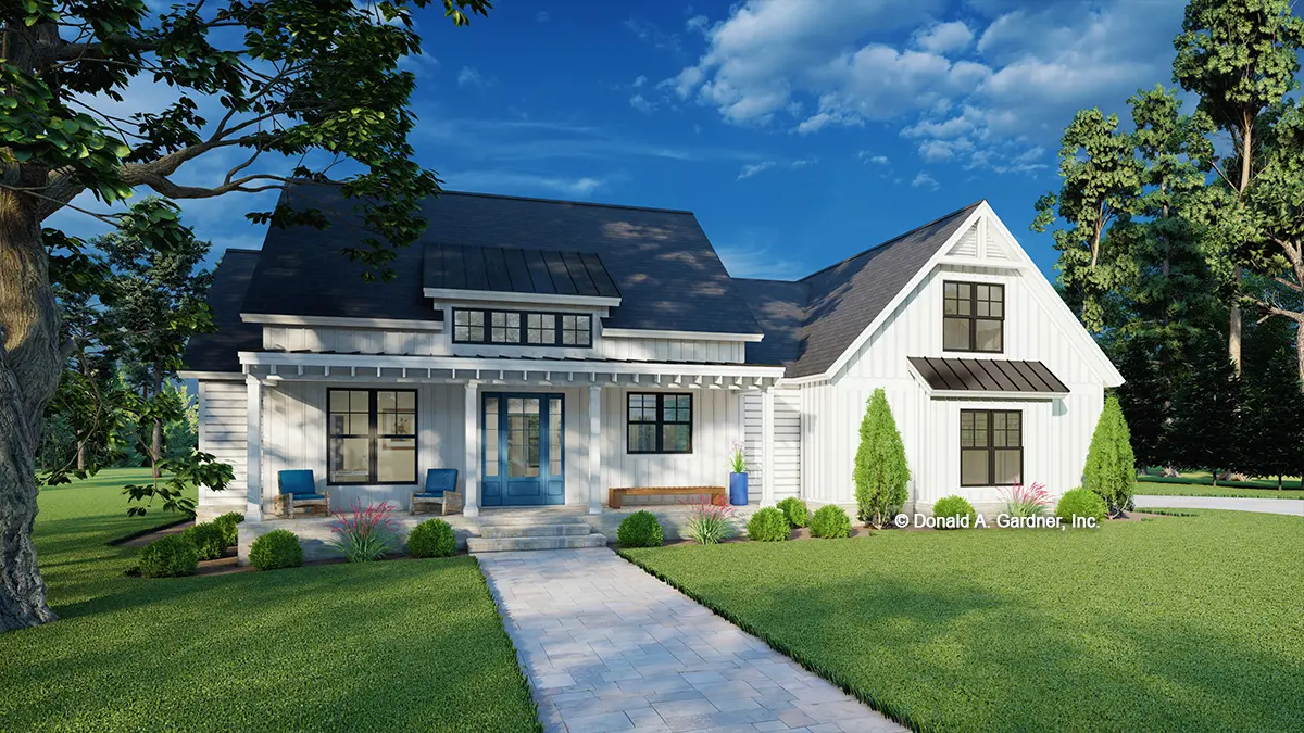 This modern farmhouse design creates a welcoming entry with a spacious front porch. Inside, the floor plan offers easy living with an open great room and dining room under a cathedral ceiling and an island kitchen with a corner pantry. The master suite enjoys skylights and the master closet connects to the utility room. Two additional bedrooms complete the first floor and a bonus room, with full bathroom and walk-in closet, is upstairs for a guest suite or media room.
