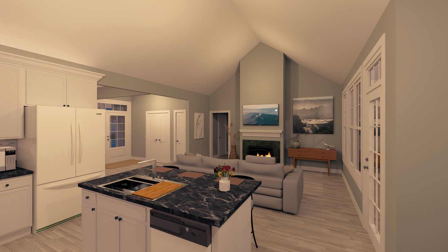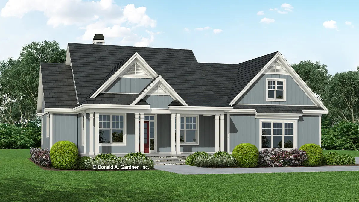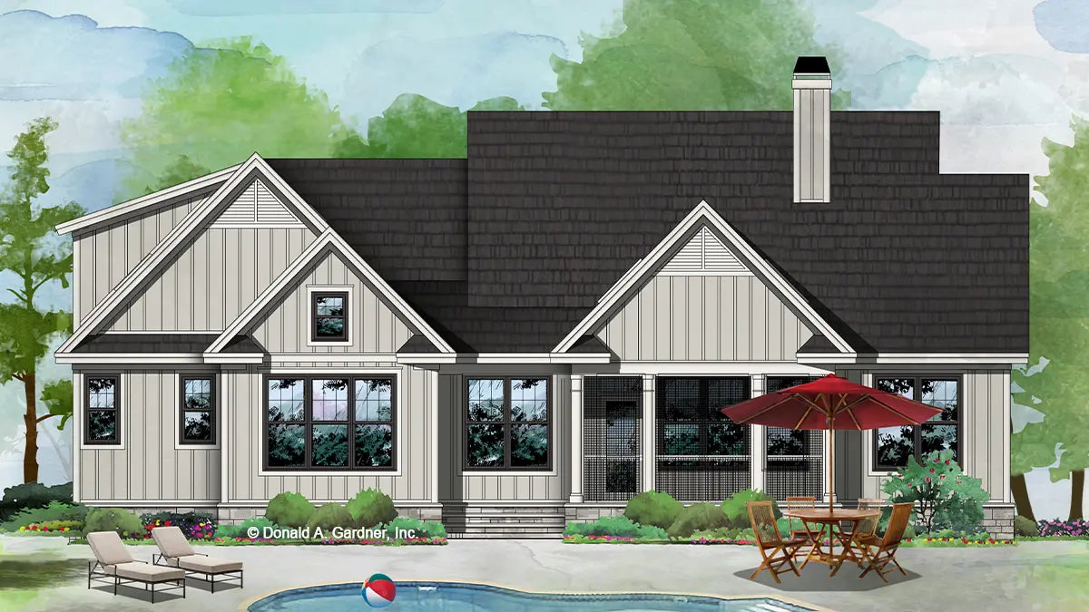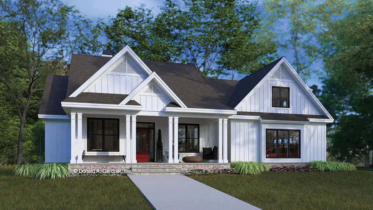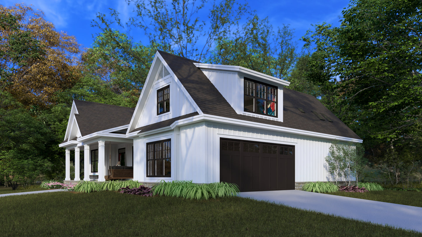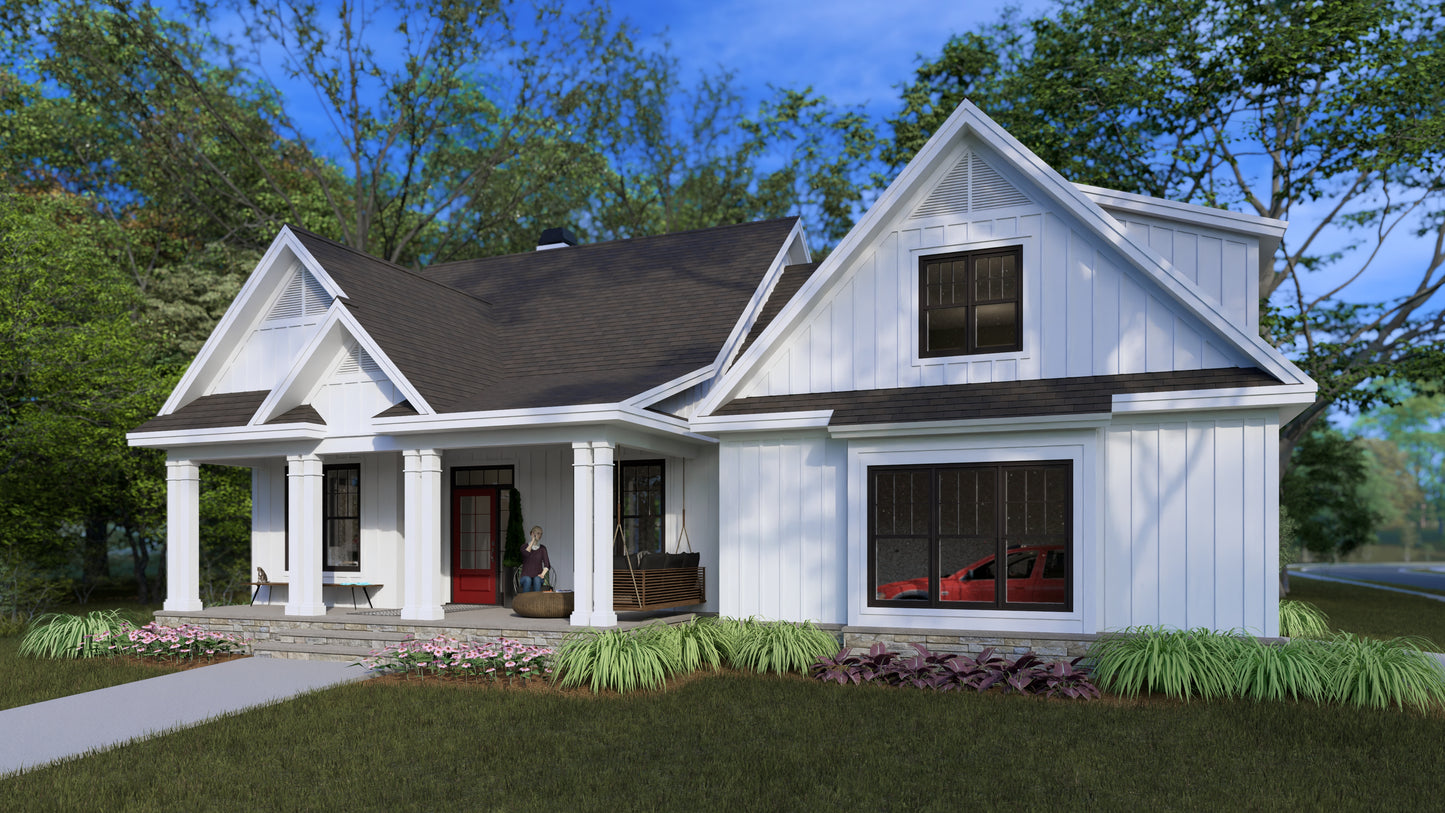 This simple, modern farmhouse offers a board-and-batten exterior and large windows. The floor plan is impressive, given the square footage, with a spacious island kitchen, breakfast nook, and dining space. The great room with fireplace opens to a screened porch with skylights. Skylights are also found in the master bathroom and sun tunnels are in the master closet and utility room, which happen to be connected. Two additional bedrooms and a bonus room complete this thoughtful design.