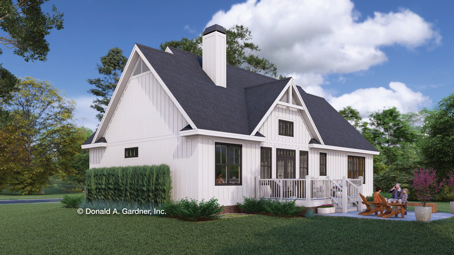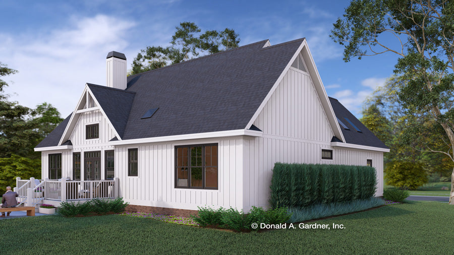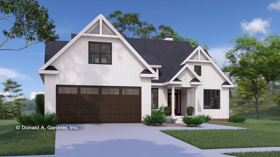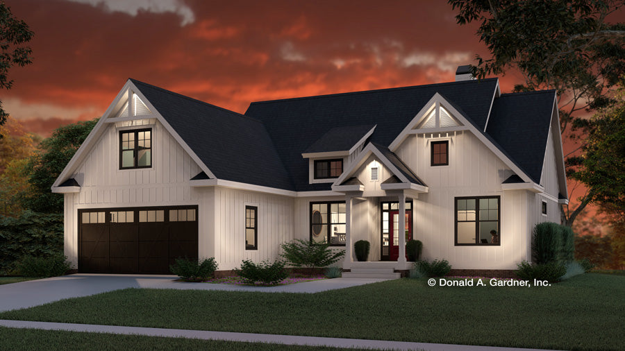 This simple white modern farmhouse facade is enhanced by bold gable brackets and a red front door. An inviting foyer greets guests and a cathedral ceiling tops the island kitchen and great room. A skylight brings light inside and a rear deck extends living outdoors. The master suite enjoys a cathedral ceiling, dual walk-in closets, and a double vanity and walk-in shower in the master bathroom. Two additional bedrooms complete the first floor and a bonus room provides additional square footage for a media room or future expansion.