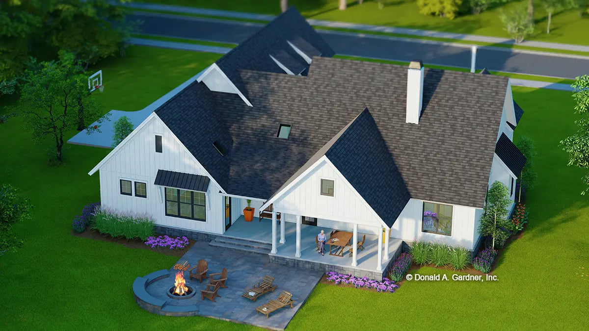 This is an illustration of the front of modern farmhouse house plan 1617 The Audrey
