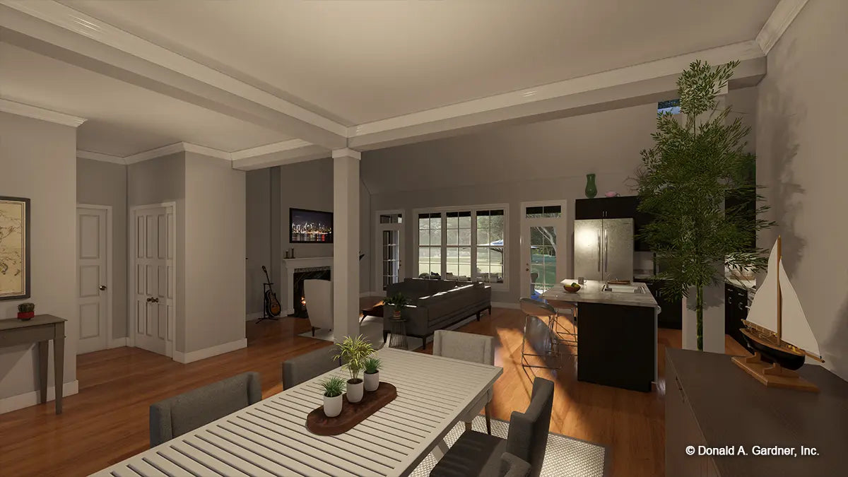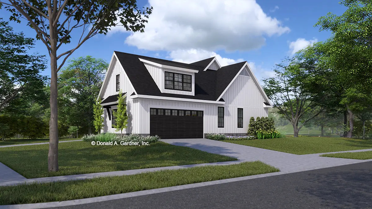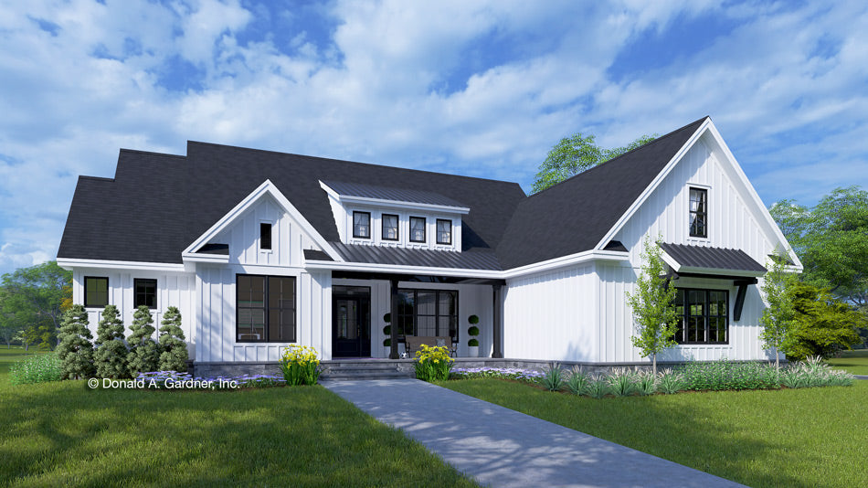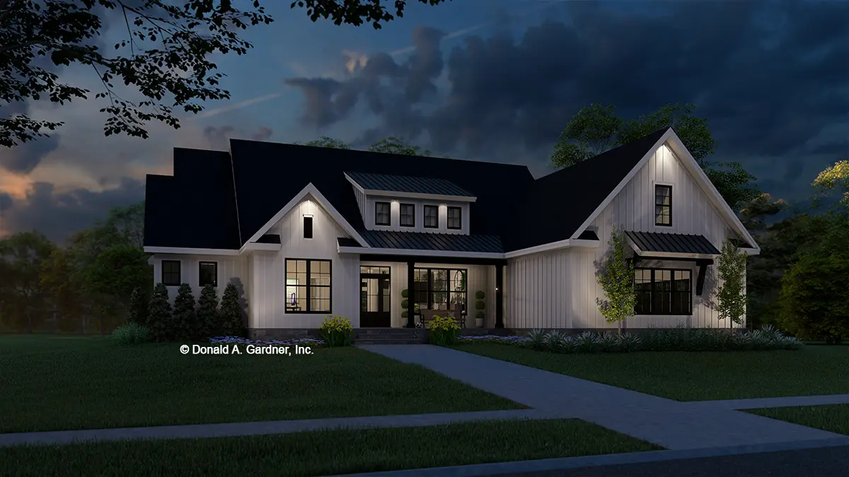 This modest modern farmhouse design features a simple board-and-batten facade with metal roof accents. The great room and island kitchen share a vaulted ceiling while the dining room is defined by columns. A rear porch with skylights extends living outdoors. The master suite enjoys a tray ceiling, rear porch access, a walk-in closet, and an efficient bathroom. An office/bedroom is available to meet the needs of the homeowner and two additional bedrooms are across the floor plan. The two-car garage opens to a multifunctional space with a utility room, pantry, and drop zone. A bonus room above the garage awaits a future expansion.