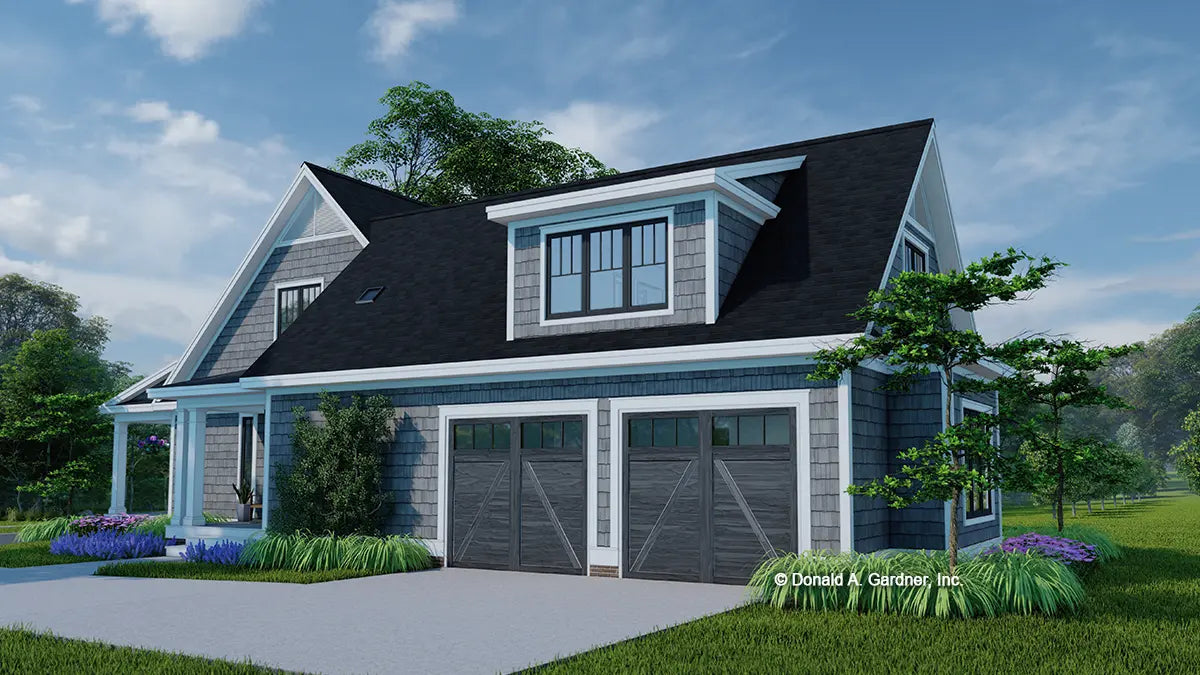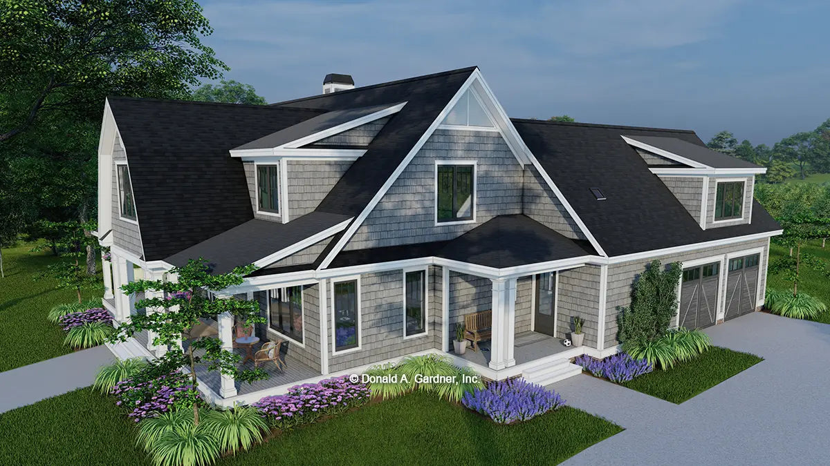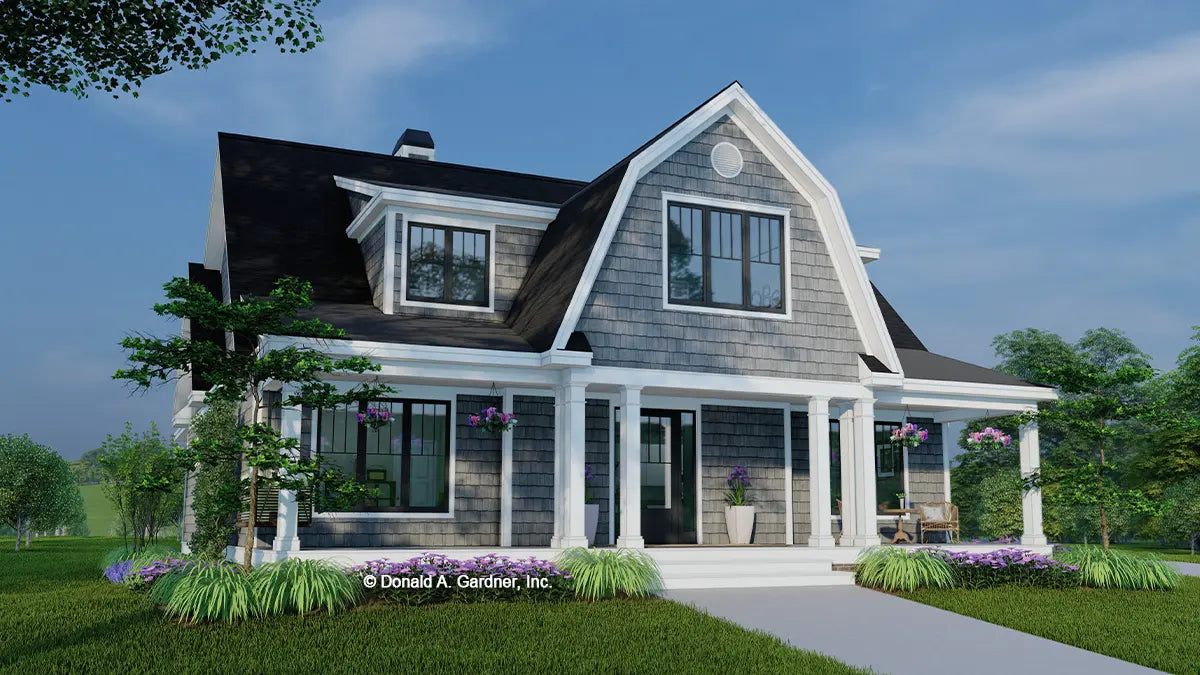 This farmhouse design features an eye-catching gambrel roof and a cedar shake facade. The sprawling front porch leads to an open floor plan with a vaulted great room, island kitchen, and spacious dining area. Located on the first floor, the master suite enjoys skylights, a walk-in closet, and a modern bathroom. The garage is positioned at the back of the home with space for two vehicles and storage. Sun tunnels bring natural light into the mudroom and utility room. A bedroom/office provides flexible space downstairs while two bedrooms and an open study are upstairs. An optional bonus room and full bathroom offer additional square footage.