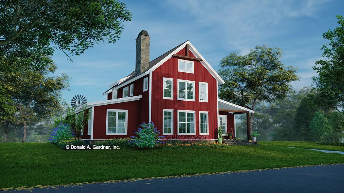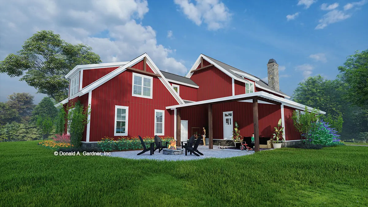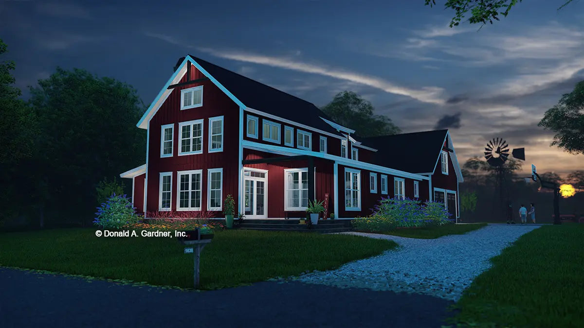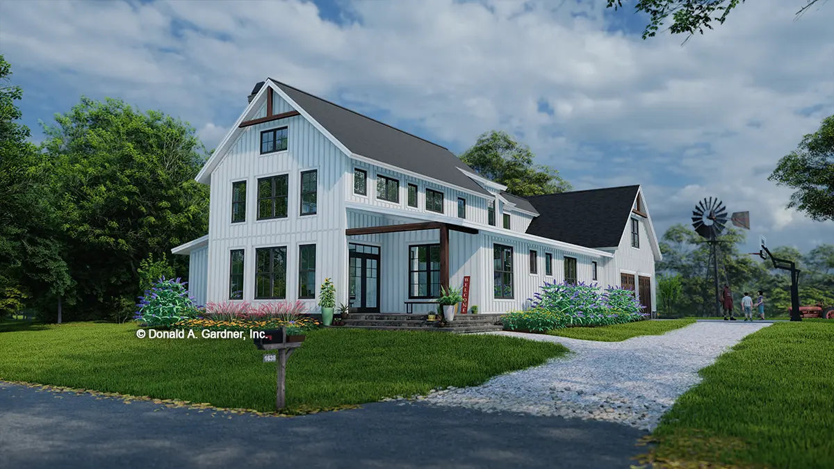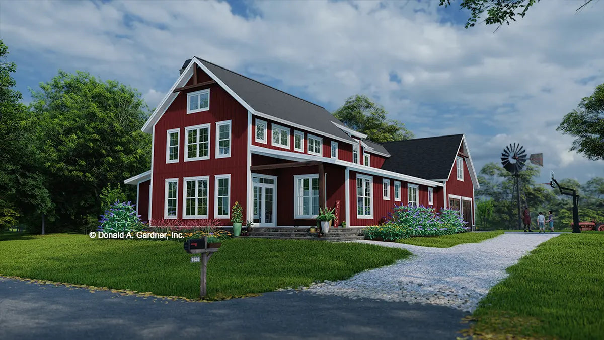 This two-story barndominium features a board-and-batten facade complemented by decorative gable trusses and a stone chimney. The two-story great room flows into an open dining area and an island kitchen. Skylights and a sun tunnel bring natural light into the master suite. Across the floor plan, two additional bedrooms share a full bathroom. The two-car garage is located at the rear of the home and leads into a mudroom with an adjoining pantry and utility room. Upstairs, find a bedroom, full bathroom, and an optional bonus room.