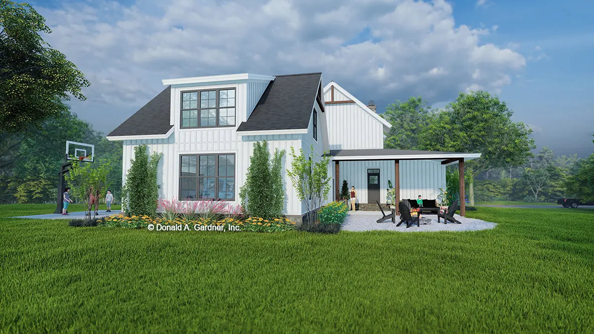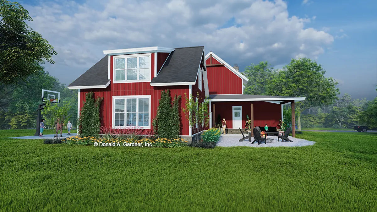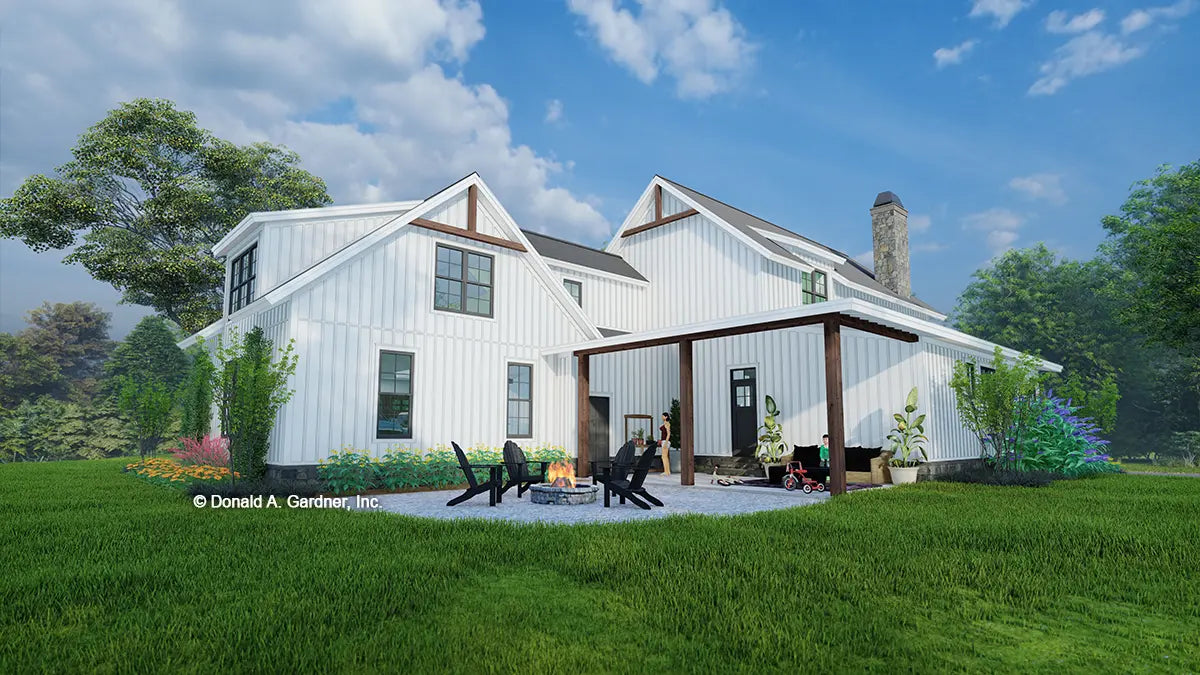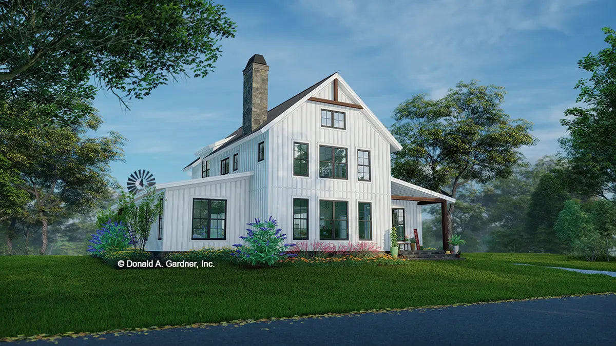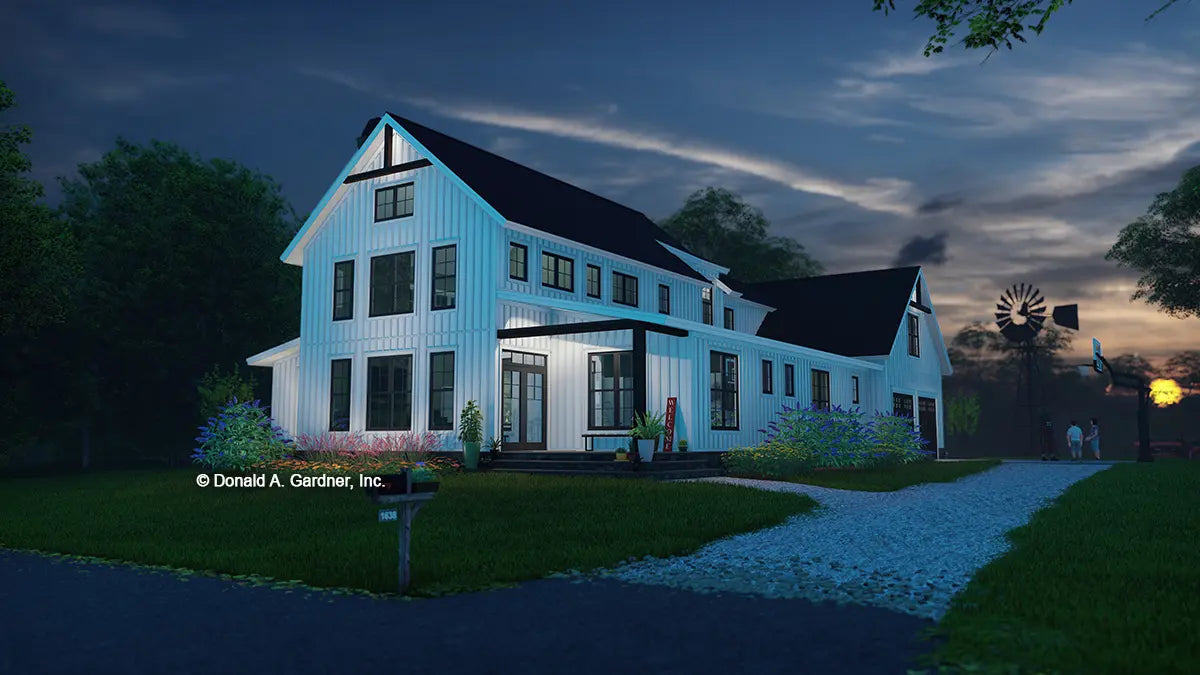 This two-story barndominium features a board-and-batten facade complemented by decorative gable trusses and a stone chimney. The two-story great room flows into an open dining area and an island kitchen. Skylights and a sun tunnel bring natural light into the master suite. Across the floor plan, two additional bedrooms share a full bathroom. The two-car garage is located at the rear of the home and leads into a mudroom with an adjoining pantry and utility room. Upstairs, find a bedroom, full bathroom, and an optional bonus room.