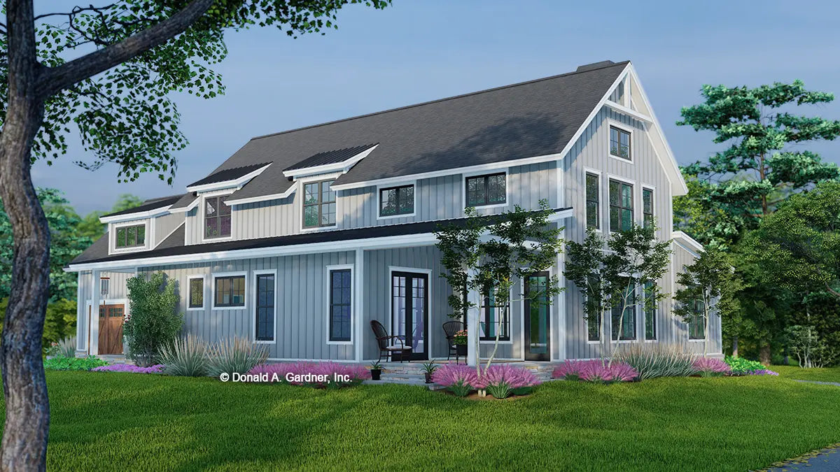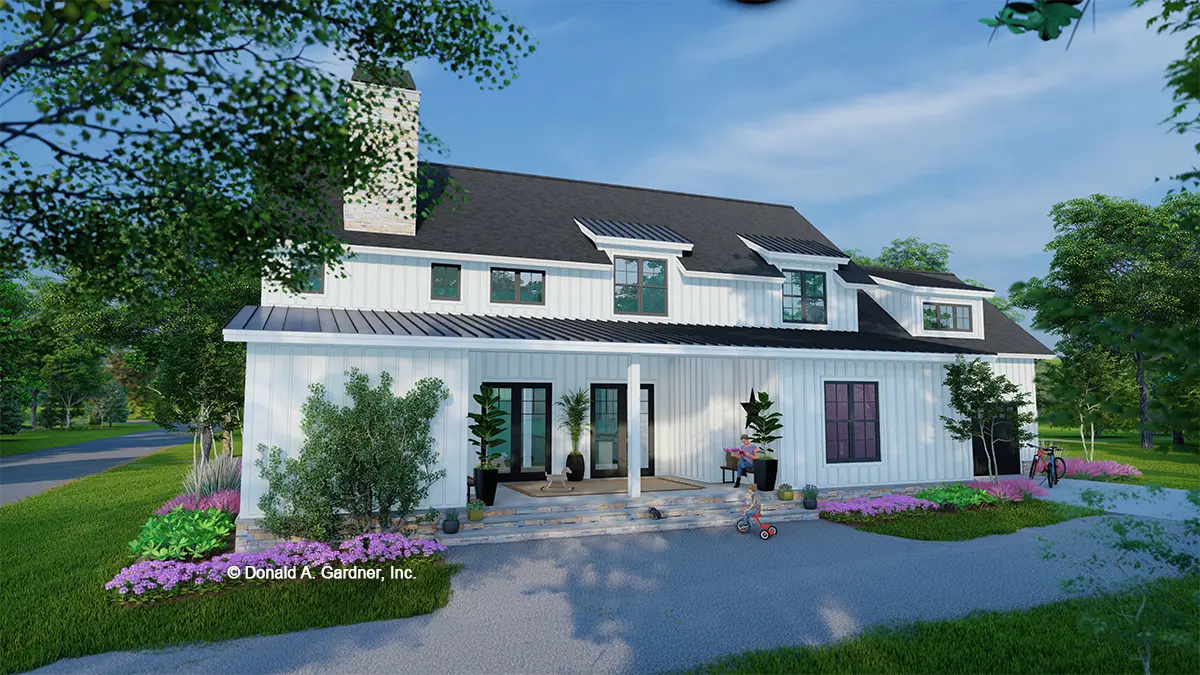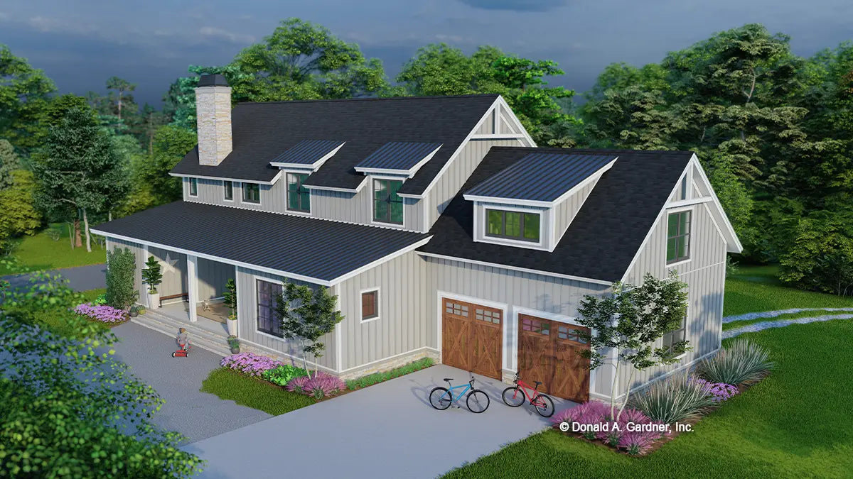 This barndominium house plan is the perfect blend of country charm and modern amenities. The board-and-batten facade is highlighted by decorative gable trusses and a stone chimney. Inside, the open floor plan offers an effortless flow for relaxing and dining. Porches are positioned around the home for easy access to outdoor living. The first-floor master suite features skylights, a thoughtfully designed bathroom, and a divided walk-in closet with a sun tunnel to welcome natural light. Two additional bedrooms are downstairs while a bedroom with a full bathroom is upstairs. A loft overlooks the great room below and an optional bonus room awaits expansion.