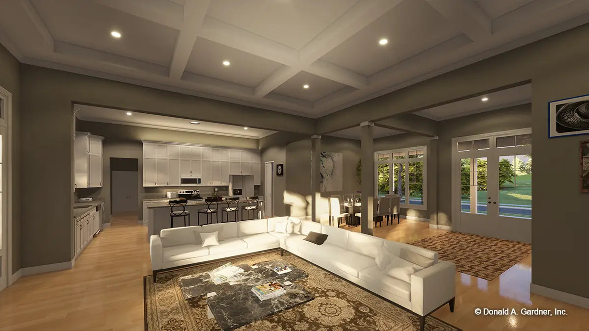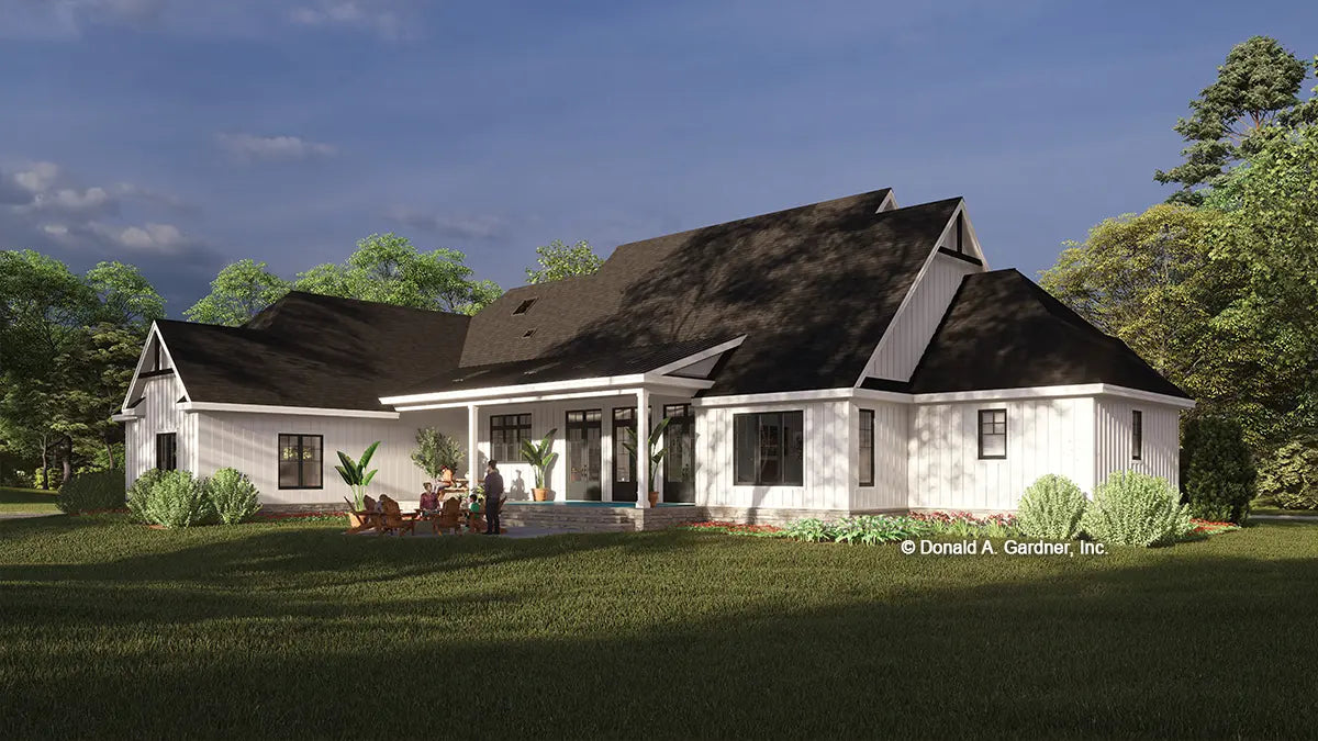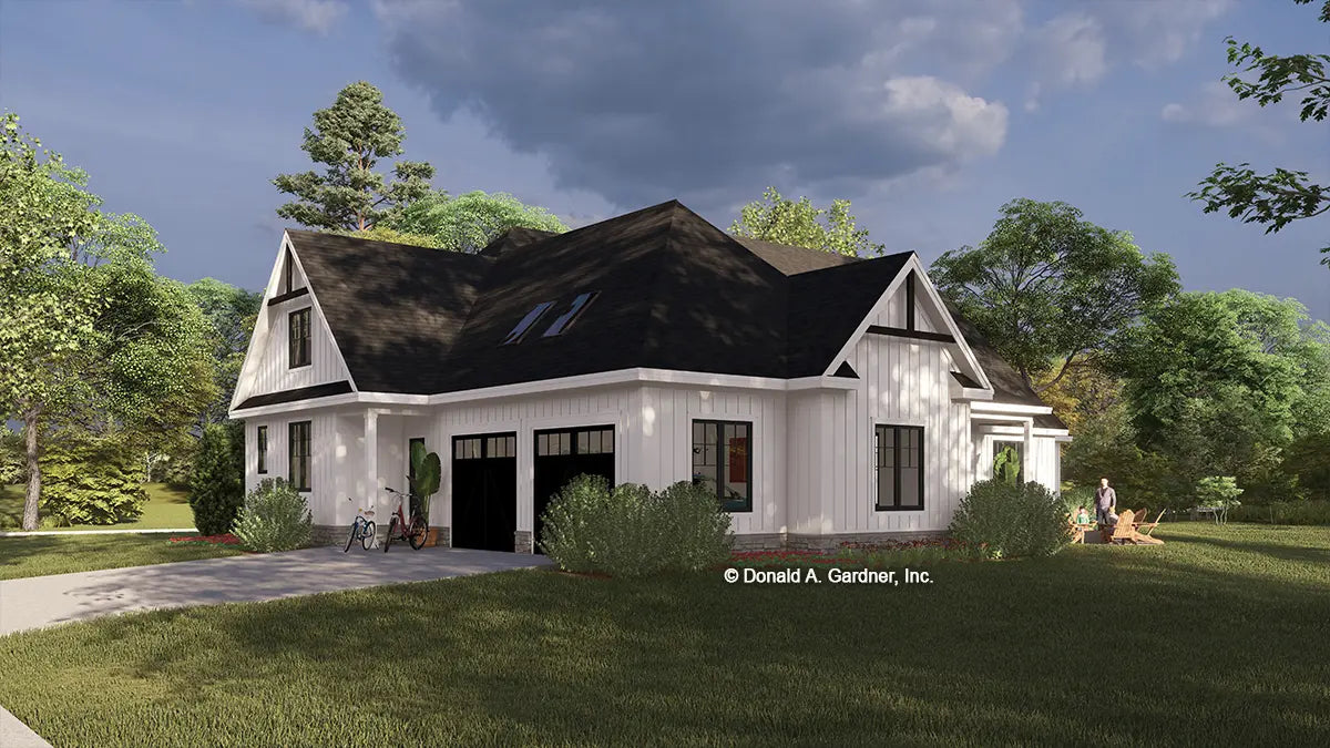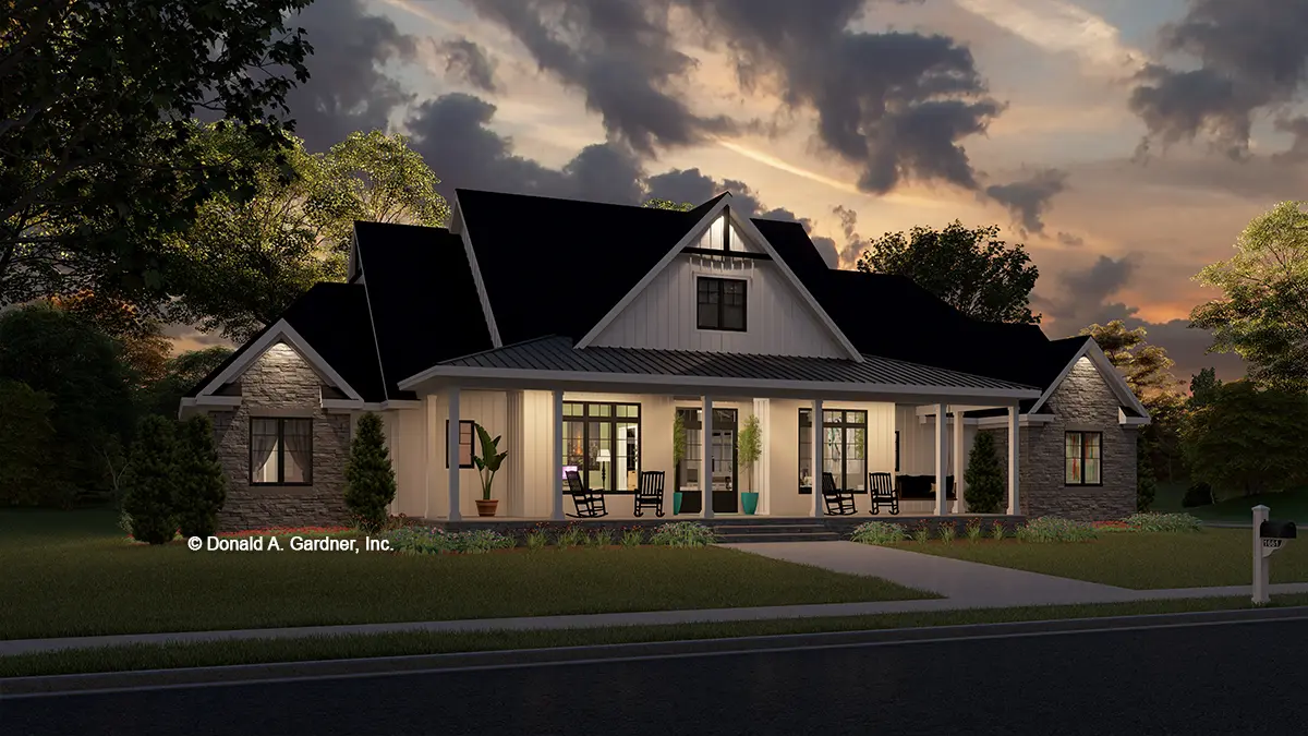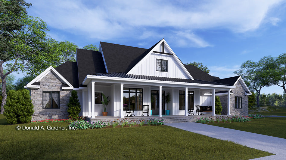 This sprawling ranch features a family-friendly floor plan with a rear located garage. The board-and-batten siding is complemented by stone, metal roof accents, and a gable bracket while a wide porch hugs the front facade. A fireplace and coffered ceiling enhance the great room and a rear porch with skylights extends living outdoors. The kitchen enjoys an island, and a sun tunnel above filters in daylight. Nearby, a butler's pantry and walk-in pantry provide convenience and a spacious dining room welcomes family meals. The master suite is luxurious with a tray ceiling, fireplace, and a walk-in closet. In the master bathroom, find a double vanity, walk-in shower, and freestanding bathtub with built-in shelves on either side. An office/bedroom meets the needs of the homeowner while two additional bedrooms are across the floor plan with a shared full bathroom. Extra amenities include a powder room, drop zone, and a large utility room with laundry sink. Upstairs, an optional bonus room and bedroom suite offer expansion opportunities.