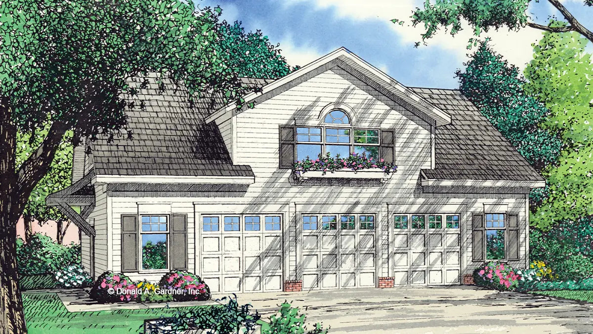 With a classic, friendly facade, the Springfield garage with apartment above offers flexible living and storage space galore. Downstairs you'll find three garage bays, plus an extra storage alcove. Upstairs is an efficient apartment layout that allows space for a home office or second bedroom, along with a kitchen, dining alcove, and balcony.
