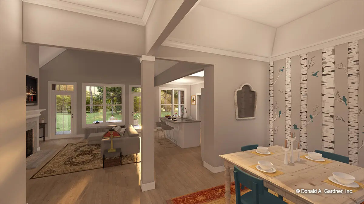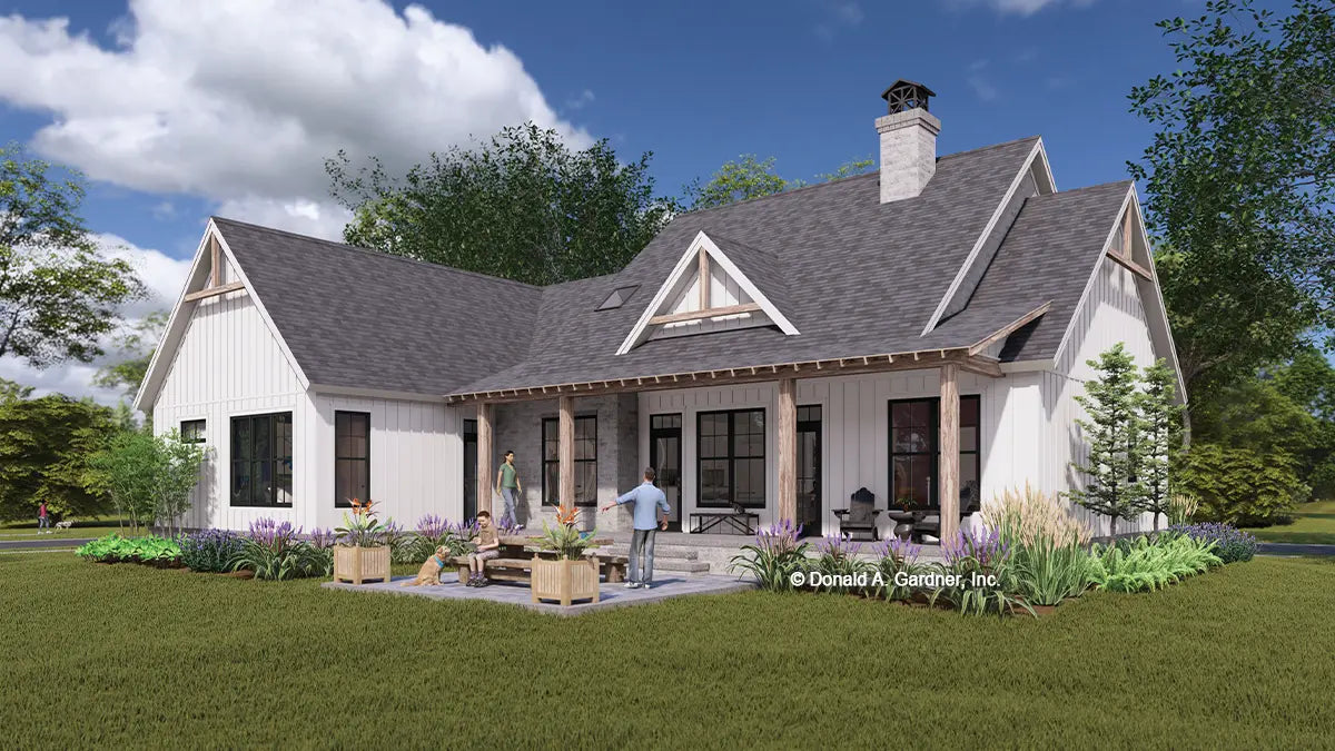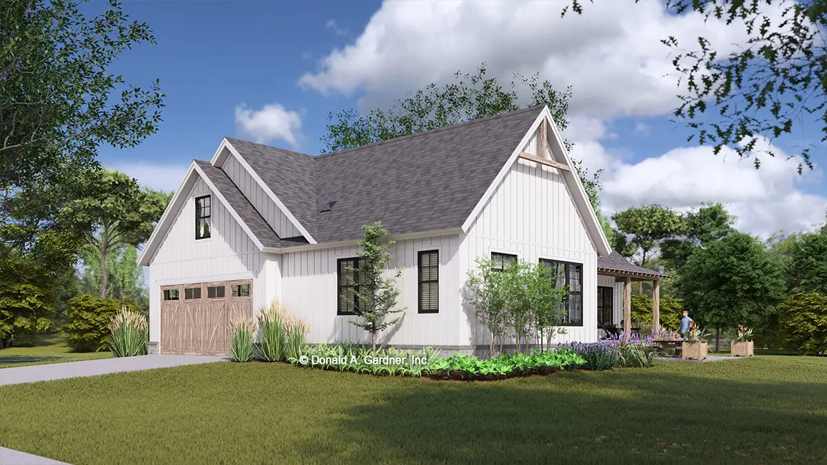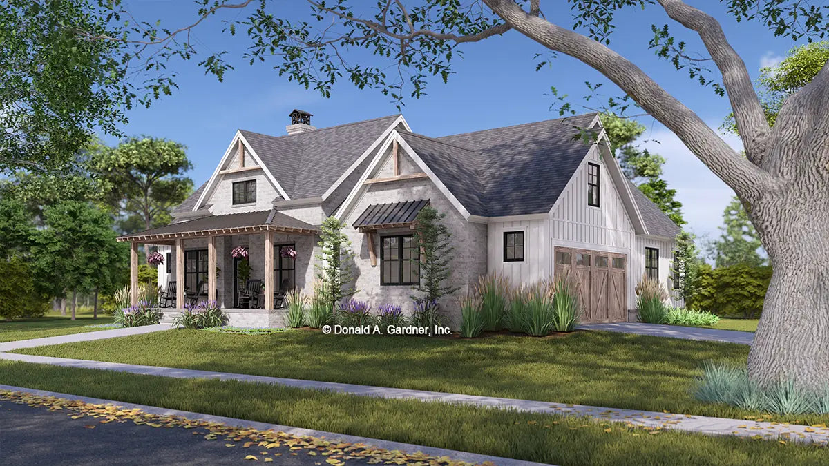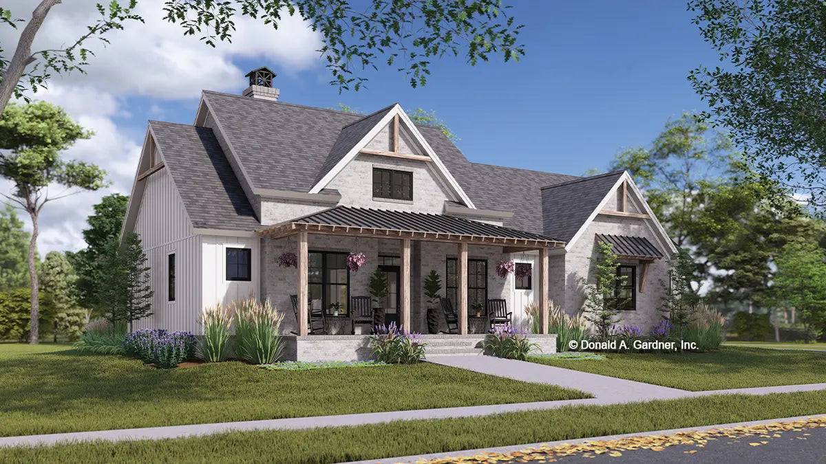 This charming modern farmhouse offers a modest floor plan wrapped in a stylish brick and board-and-batten facade. Wanting for nothing, the open layout features a vaulted great room with fireplace, an island kitchen with a skylight and nearby pantry, and separate breakfast and dining spaces. Sprawling front and rear porches extend living outdoors. The master suite enjoys a cathedral ceiling, walk-in closet, and a welcoming bathroom with dual vanity, freestanding bathtub, and walk-in shower. Two additional bedrooms are across the floor plan with a shared bathroom. Find storage in the garage and a drop zone with a built-in bench, coat closet, and adjoining utility room. An optional bonus room provides expansion opportunities.