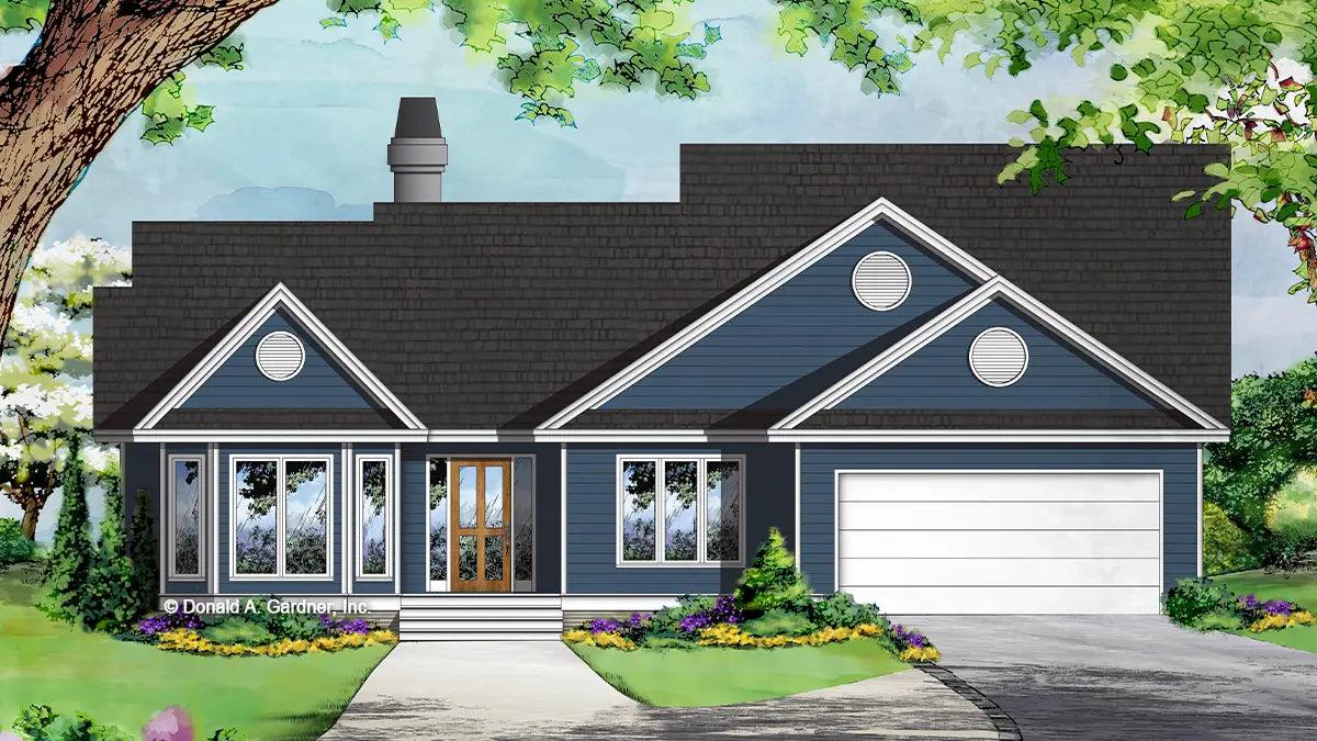 This neighborhood-friendly design is ideal for a narrow lot with multiple front-facing gables and a front-entry garage. The open kitchen overlooks the breakfast room and a dining room is nearby. Skylights highlight the cathedral ceiling in the great room and a separate living room is just steps away. The master suite offers access to a private rear deck and the master bathroom is luxurious with a dual-sink vanity, soaking bathtub and a walk-in shower. Two additional bedrooms share a bathroom and have access to spacious storage in the hallway.