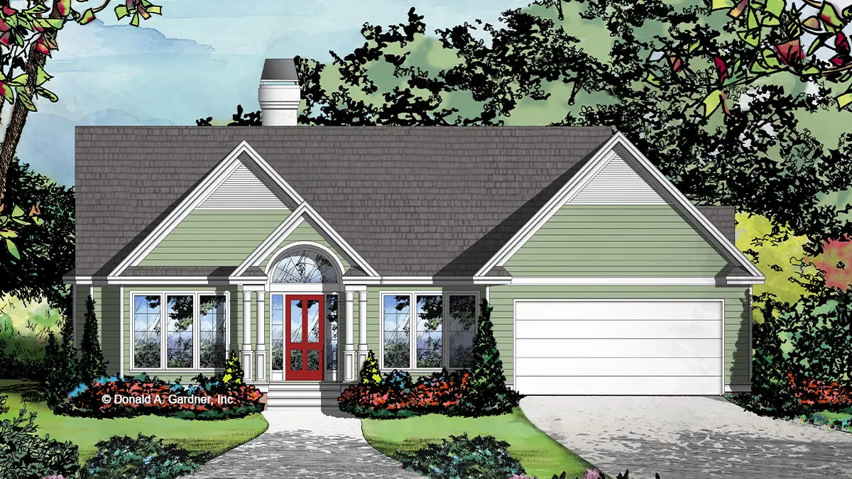 This simple ranch home design gains character from an arched front entry with a half-circle Palladian window. The foyer is punctuated by columns and opens to the great room topped with a cathedral ceiling. An arched window sits above doors that open to an expansive rear deck. The kitchen features an island and eat-in breakfast nook while a dining room is available for formal gatherings. The master suite is accompanied by two additional bedrooms.