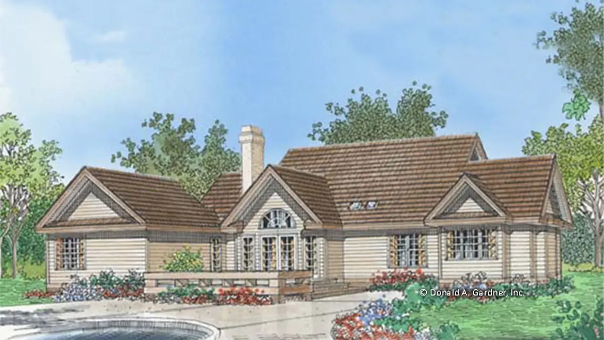 Arched windows, dormers, front and side porches, rear deck, and an open interior give this compact three-bedroom house plan a much larger feeling than its modest square footage would indicate. Elegant columns define the dining room in this home plan, while the great room gains an open, airy feeling from the cathedral ceiling and arched window above a sliding door. The master suite pampers with a private bath that includes a whirlpool tub, separate shower, double bowl vanity, linen closet, and walk-in closet.