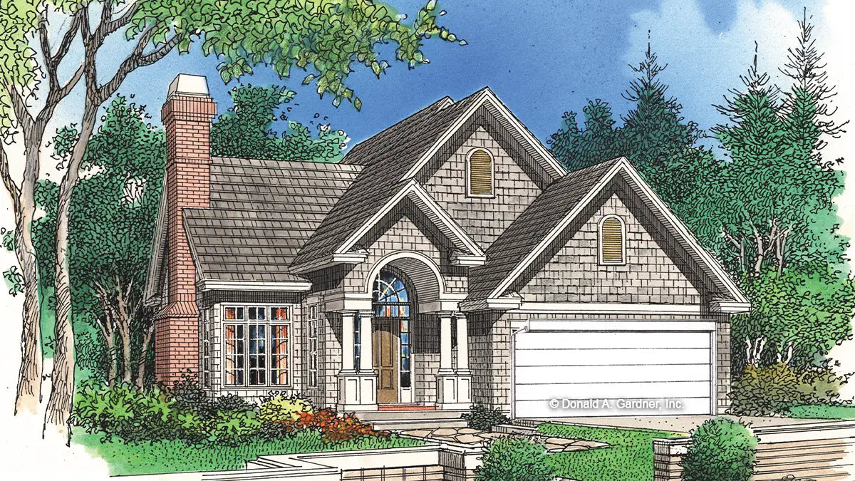 Dramatic details inside and out, such as a barrel-vaulted porch, detailed columns, and a curved balcony overlooking the dining/great room add European flavor to this delightful design, while a width of only forty feet perfectly suits this floor plan for narrow lot. The kitchen/breakfast area features a service island, and a large, handy utility room also acts as a mud room off the garage. The first level master bedroom provides plenty of privacy and luxury with a whirlpool tub, separate shower, and double lavs.