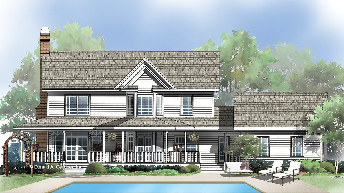 Palladian and arched windows, a double gabled roof, intricately detailed brick chimney and wrap-around porch combine to give this grand farmhouse home plan its timeless appeal. An exceptionally large great room with fireplace and wet bar extends the depth of this open floor plan. The lavish kitchen with cooking island serves the deck and both dining areas. A generous master suite is complete with large walk-in closet and master bath with whirlpool and shower. Three additional family bedrooms are also located upstairs.