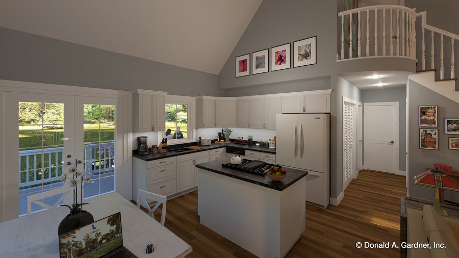 Here's a rural cabin retreat that's perfect as a starter home or a vacation getaway. Full front and back porches, a stone fireplace, and a box bay window in the kitchen/dining room lend character to this rustic, three-bedroom cottage. The exceptionally open floor plan receives added volume from a cathedral ceiling over the combined kitchen area and great room. The master suite is privately located upstairs and features a large walk-in closet, double vanity, and garden tub framed by a window. The second-floor hall ends with a balcony that overlooks the two-story common rooms, and the layout allows for an abundance of light.