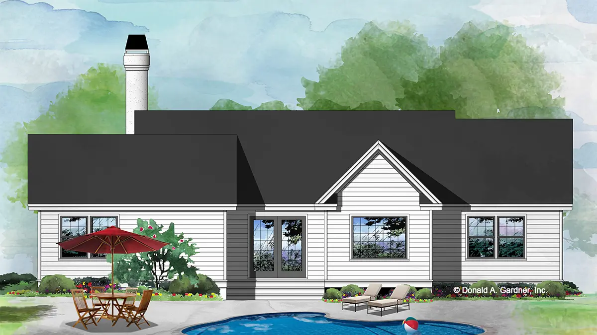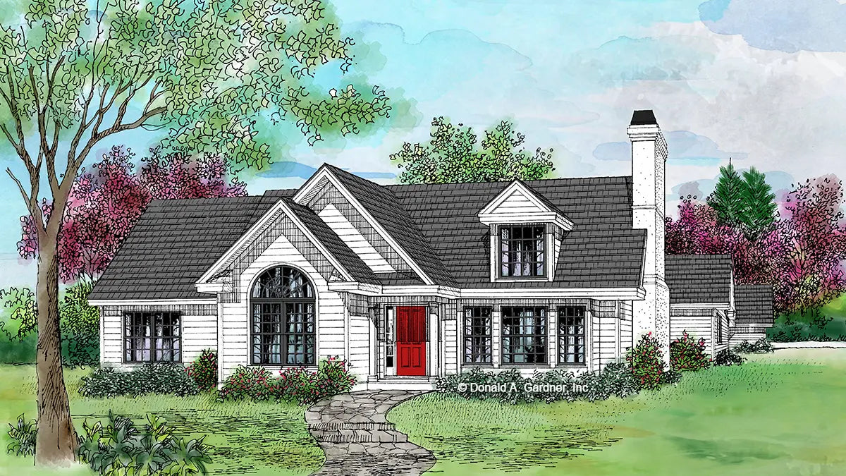 A round-top window and a single dormer above the great room brighten this country traditional house plan with open interior. Elegant round columns accent and define the dining and kitchen areas from the great room. Cathedral ceilings offer this floor plan a spacious open feeling. The master bedroom, located at the rear, enjoys a private bath with double bowl vanity, shower, and whirlpool tub. The bedroom off the foyer can also double as a study.