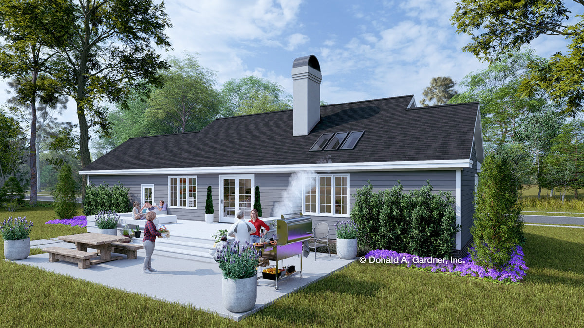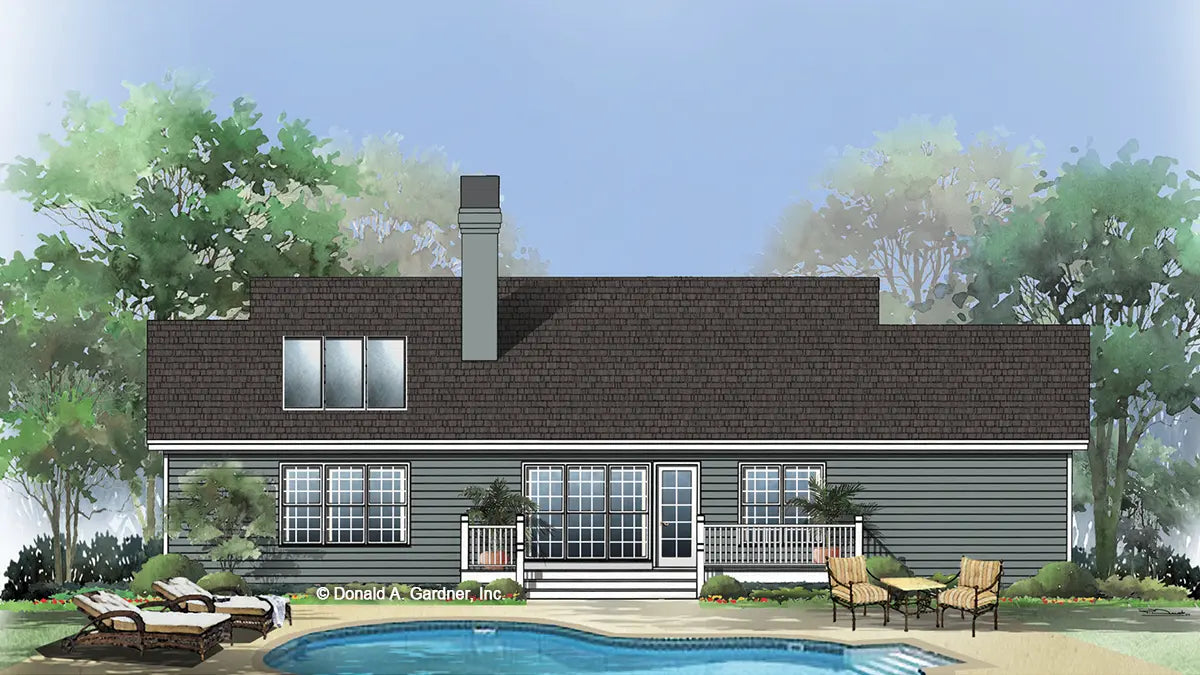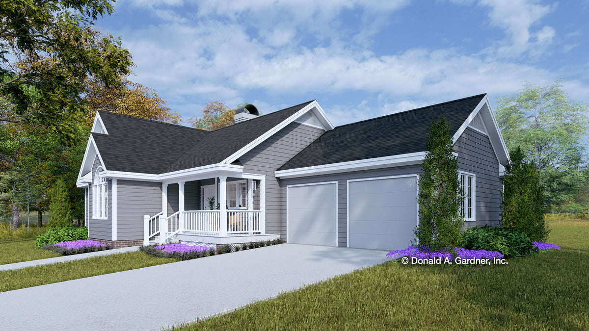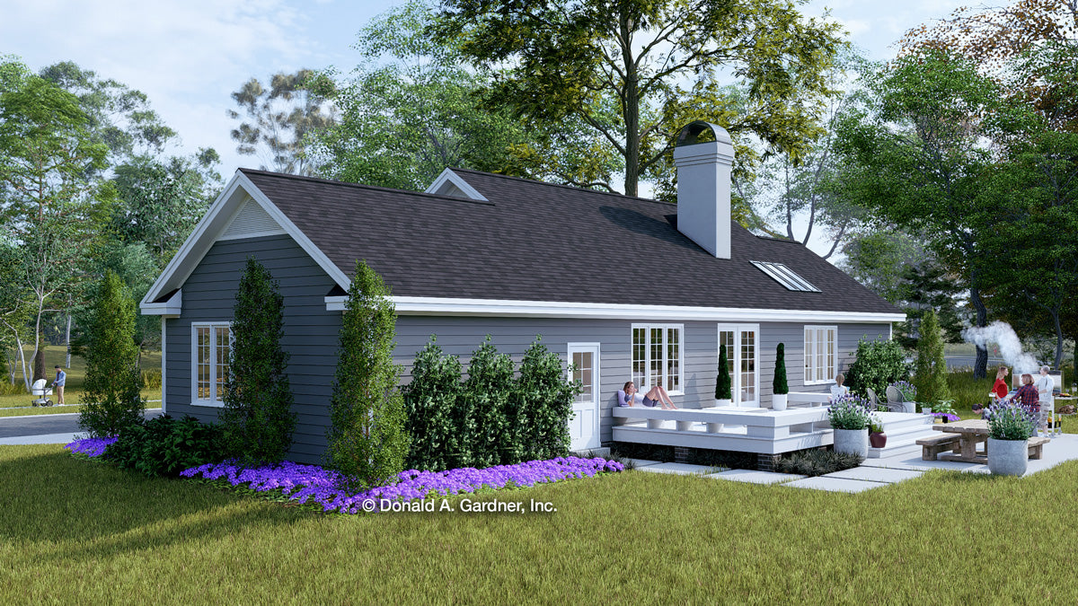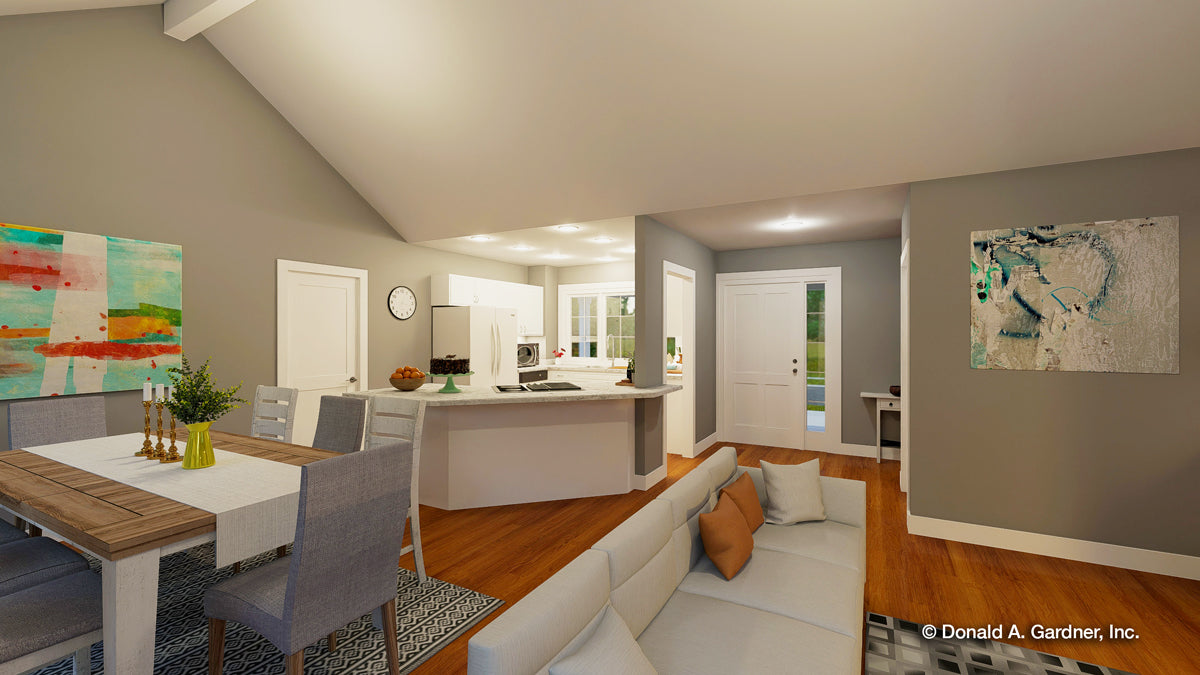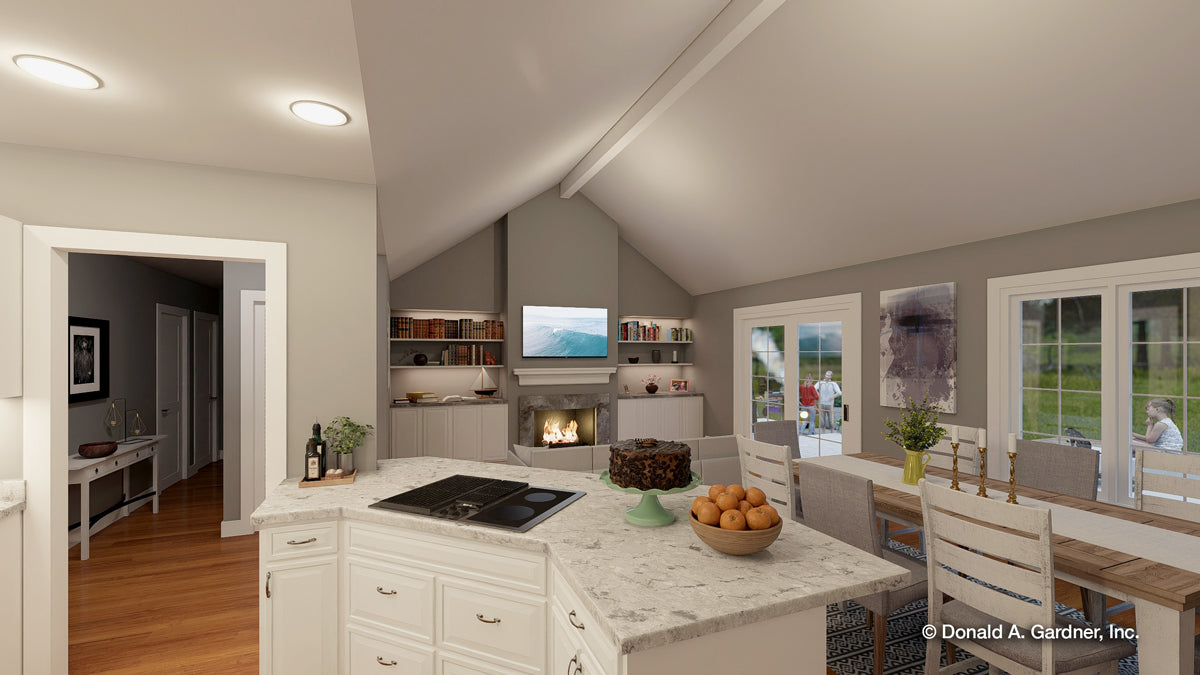 Economical means exciting in this well-proportioned three bedroom country house plan with fun exterior detailing. The heart of this home is the common great room, kitchen, and dining area, which provides exceptional openness for visual interaction. Cathedral ceilings and built-in shelves and cabinets on either side of the fireplace add to the excitement. The spacious kitchen features an angled cooktop island with breakfast bar. A cathedral ceiling expands the master suite with its walk-in closet. A whirlpool tub, separate shower, and dual vanities highlight the master bath in this exciting floor plan.