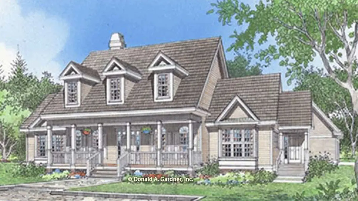 Gables, dormers, and intricately detailed columns bring a stately symmetry to this four-bedroom farmhouse. An elegant curved balcony overlooks the large great room with cathedral ceiling and clerestory dormer windows. Columns open the breakfast area to the great room and the dining room to the foyer. The kitchen boasts a center island cooktop and wet bar. Nine-foot ceilings create volume throughout. Covered porches front and rear, a large deck with spa, and a bonus room expand your options.