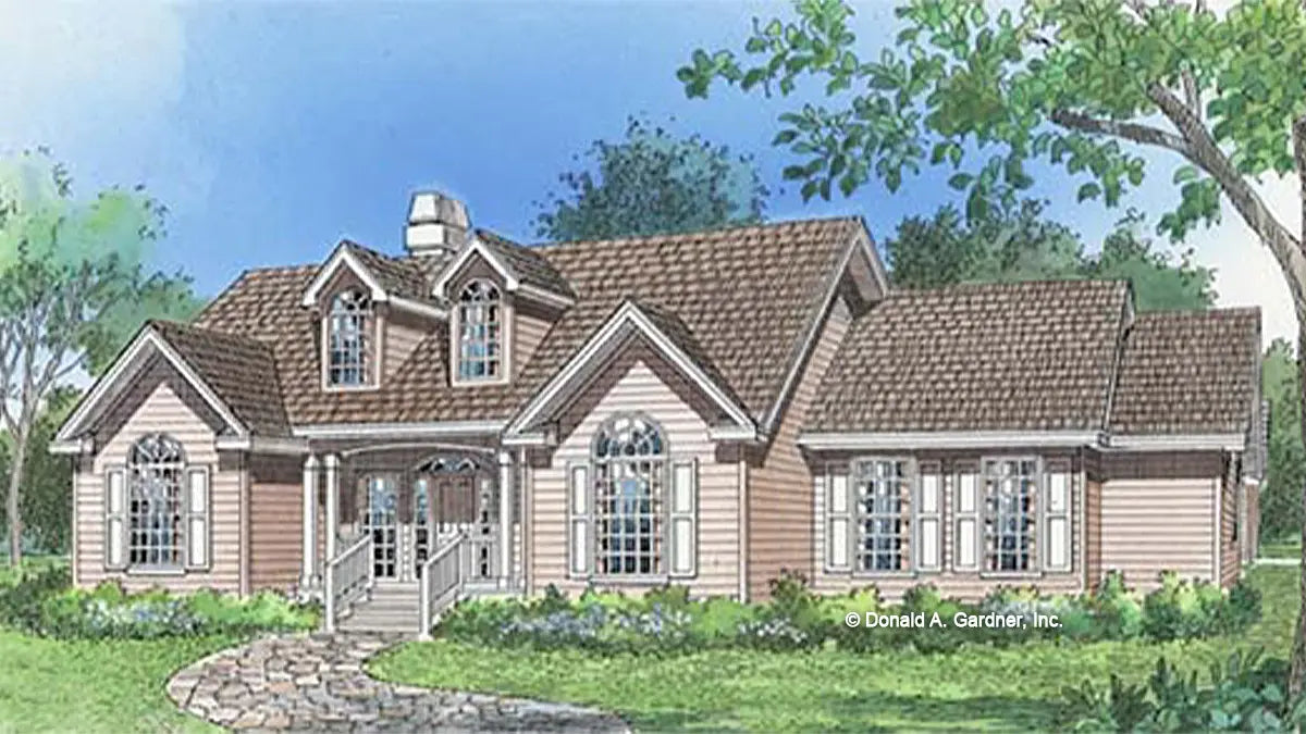 We captured a lot of country charm and excitement in this economical three bedroom plan that belies its compact square footage. The foyer with dual coat closets leads to the great room/dining room with cathedral ceiling and a bank of operable skylights. Open to the dining area, the kitchen features well-planned counter space, a large picture window with arched top, and a breakfast counter. The private master suite has a tray ceiling and luxurious bath featuring double vanity, separate shower, and operable skylights over the whirlpool tub.
